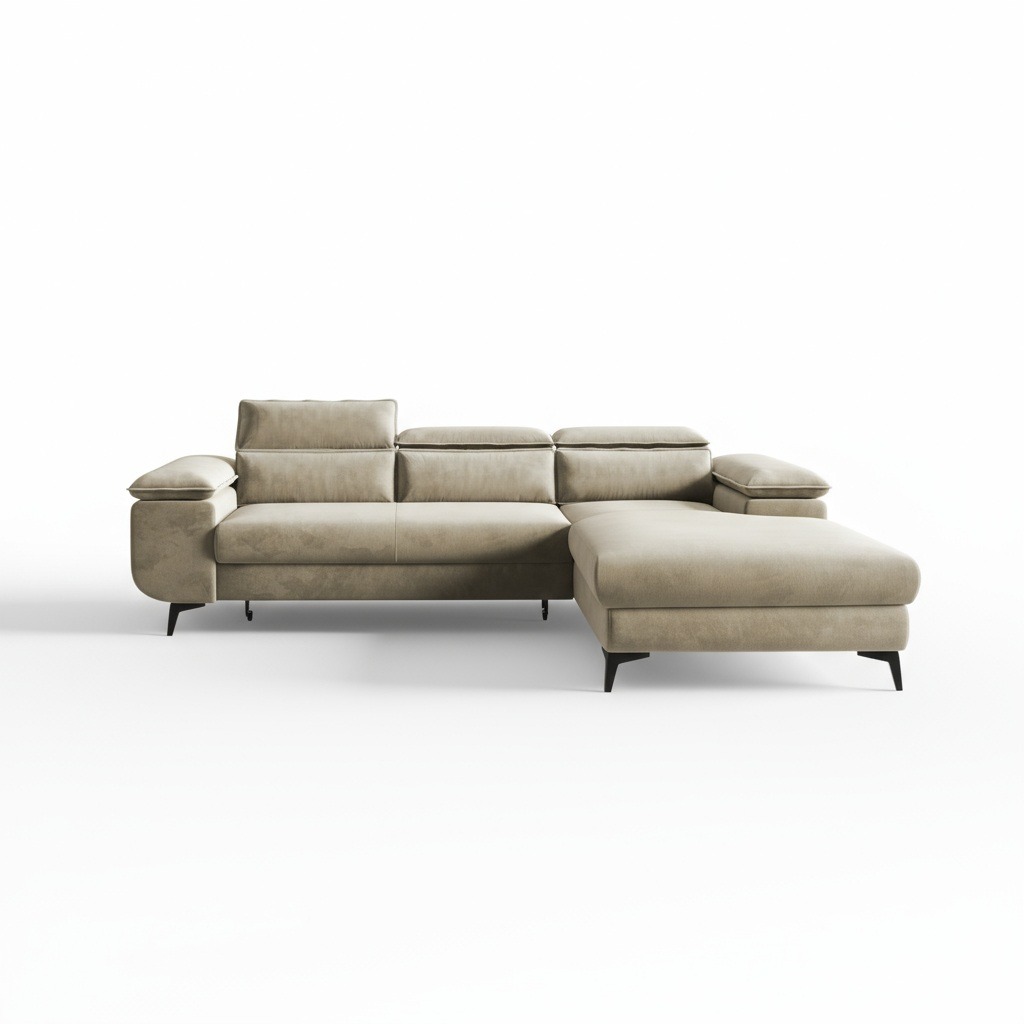 Jego ponadczasowy design z łatwością dopasuje się do wnętrz nowoczesnych oraz klasycznych. Konstrukcja w kształcie litery L w naturalny sposób organizuje przestrzeń salonu. Ciepły, beżowy odcień tkaniny rozjaśnia pomieszczenie. Wprowadza do niego atmosferę spokoju i przytulności. Dzięki temu narożnik staje się idealną bazą dla wielu aranżacji. Można go zestawiać zarówno z drewnem, jak i z metalowymi akcentami. Całość osadzono na wysokich, czarnych nóżkach, które dodają bryle lekkości.