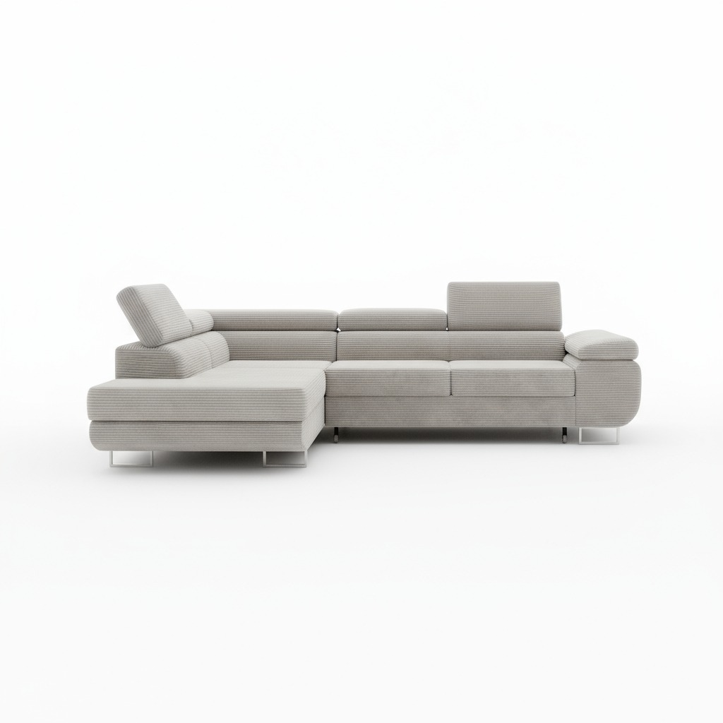 Siedzisko wypełnione sprężynami falistymi i pianką zapewnia stabilne podparcie. Dlatego jest idealnym miejscem do odpoczynku po długim dniu. Regulowane zagłówki pozwalają dopasować oparcie do indywidualnych potrzeb. Każdy z domowników znajdzie idealną pozycję podczas wieczornego seansu filmowego. Co ważne, całość pokrywa sztruksowa tkanina Poso. Jej przyjemna w dotyku faktura dodaje wnętrzu przytulności i wizualnego ciepła.