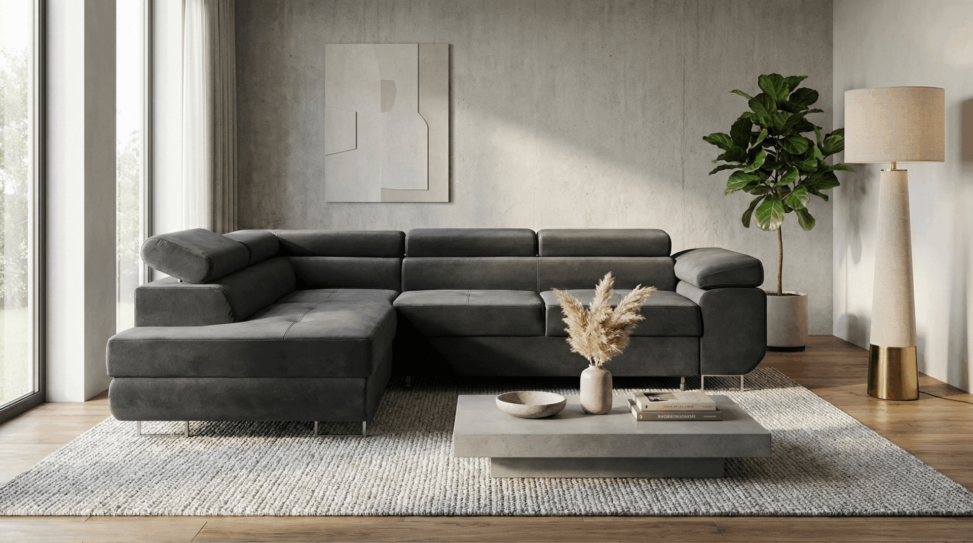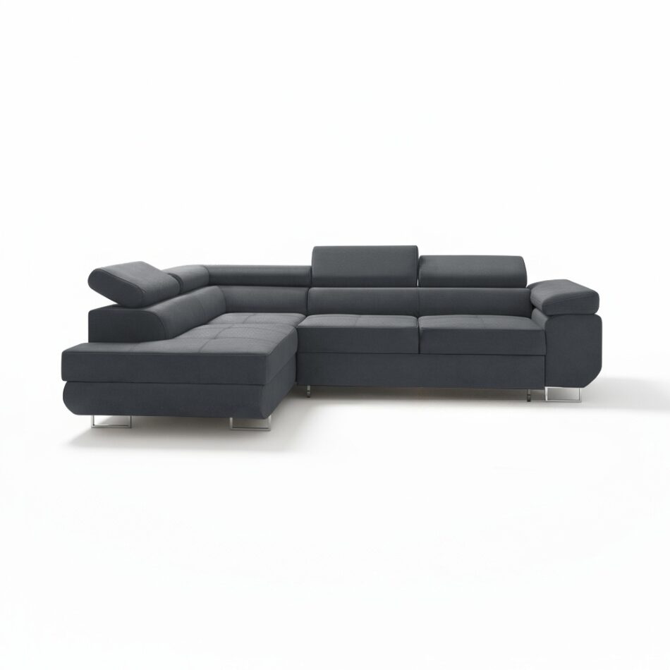 Jego prosta, geometryczna bryła zyskuje lekkość dzięki wysokim, chromowanym nóżkom. Narożnik w kształcie L doskonale wypełnia przestrzeń w salonie, tworząc wygodne miejsce do wspólnego spędzania czasu. Głęboki grafitowy odcień wprowadza do wnętrza atmosferę elegancji i spokoju. Dlatego idealnie pasuje do aranżacji nowoczesnych oraz industrialnych, stając się ich wyrazistym akcentem.