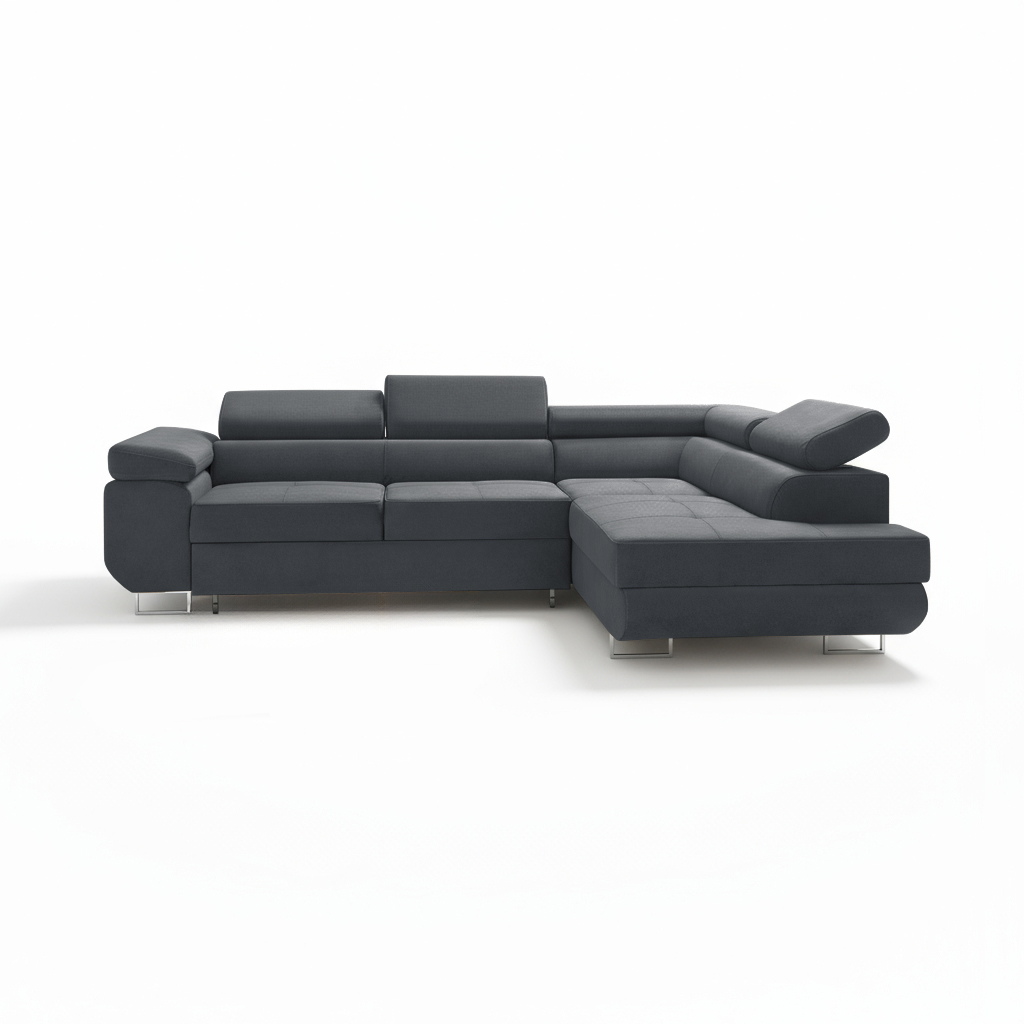 Komfort codziennego wypoczynku zapewniają regulowane zagłówki. Każdy z domowników może dopasować ich wysokość do swoich potrzeb. W ten sposób wieczorny seans filmowy lub lektura książki stają się jeszcze przyjemniejsze. Siedzisko wypełnione sprężynami falistymi oraz pianką poliuretanową gwarantuje stabilne i elastyczne podparcie. Dlatego narożnik świetnie sprawdza się podczas długich spotkań z rodziną lub chwil relaksu po pracy.