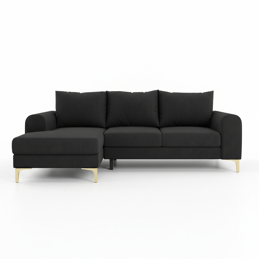 Jego kształt w formie litery L naturalnie wyznacza w salonie strefę relaksu. Głęboki, grafitowy odcień tapicerki dodaje aranżacji szlachetnego charakteru. Dlatego doskonale odnajduje się we wnętrzach nowoczesnych oraz w stylu boho. Wysokie, złote nóżki nadają całej bryle wizualnej lekkości. Jednocześnie subtelnie przełamują stonowaną barwę obicia.