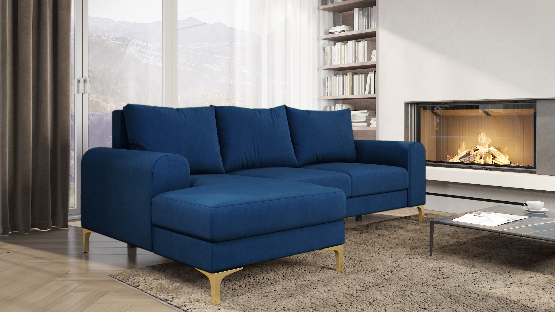 Jego L-kształtny układ doskonale organizuje przestrzeń w salonie. Wysokie, metalowe nóżki w czarnym kolorze dodają konstrukcji wizualnej lekkości. Głęboki granatowy odcień tapicerki tworzy atmosferę spokoju i wyrafinowania. Dlatego narożnik Instra będzie pięknym tłem dla wnętrz w stylu nowoczesnym oraz boho. Jego barwa pozwala na kreatywne łączenie z dodatkami w odcieniach złota, drewna lub bieli.