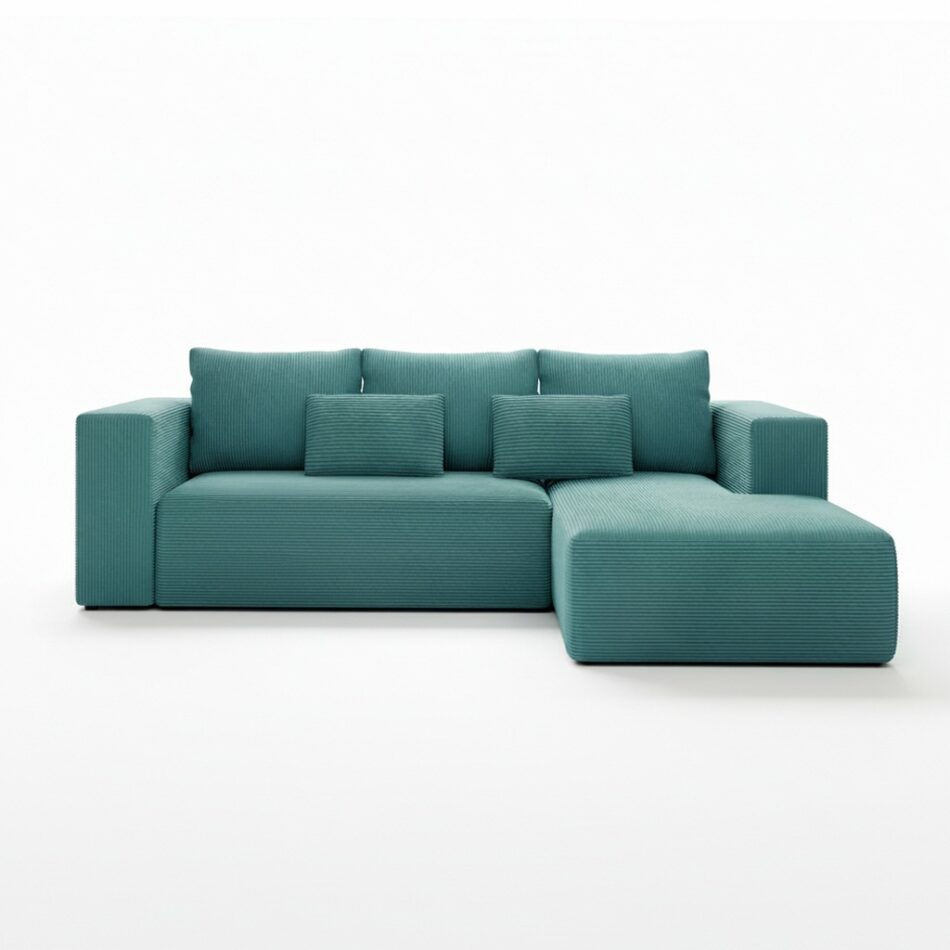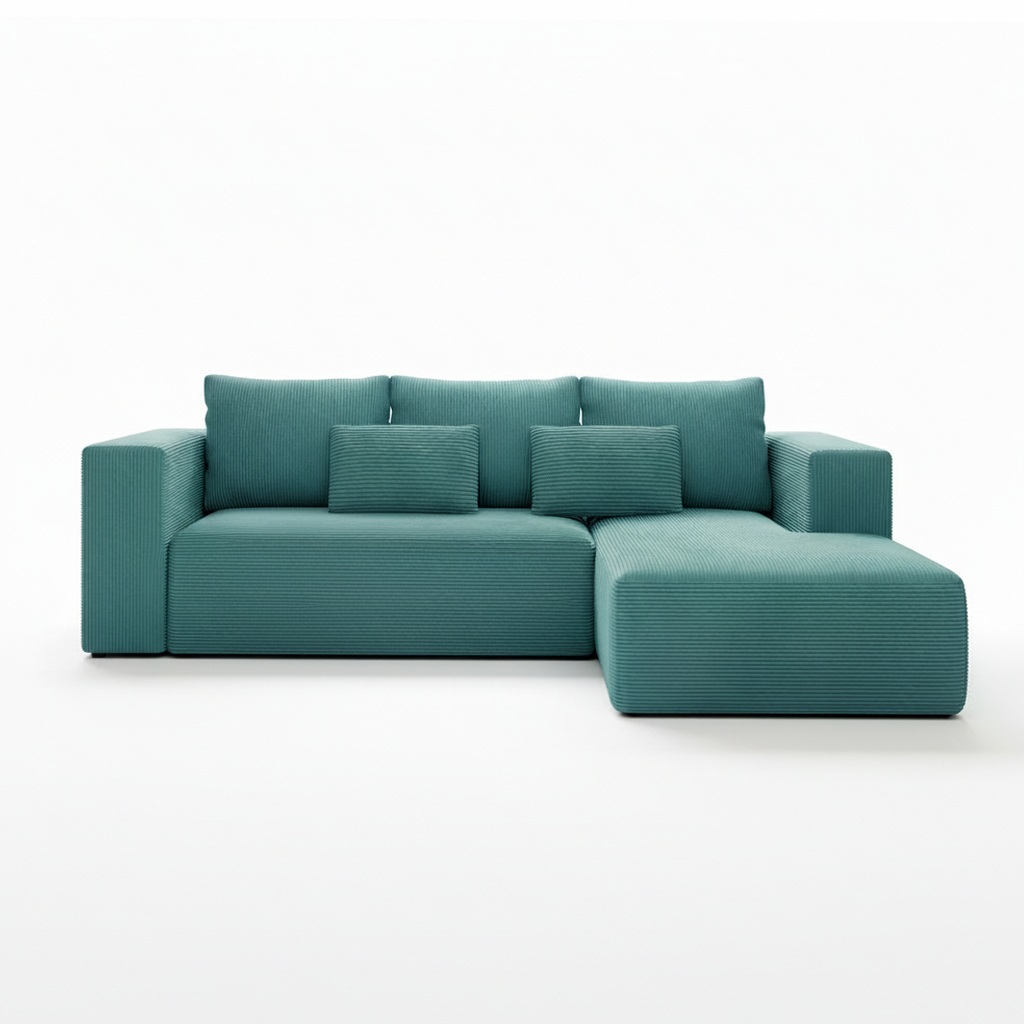 Jego L-kształtna forma doskonale organizuje przestrzeń w salonie. Wyrazisty turkusowy odcień wnosi do aranżacji energię oraz powiew świeżości. Kolor ten pięknie komponuje się z jasnym drewnem lub dodatkami w odcieniach bieli. W ten sposób tworzy wnętrze z nowoczesnym charakterem. Duże, luźne poduszki oparciowe zapraszają do wygodnego odpoczynku. Co ważne, tapicerowany tył mebla pozwala na ustawienie go w dowolnym miejscu pokoju.