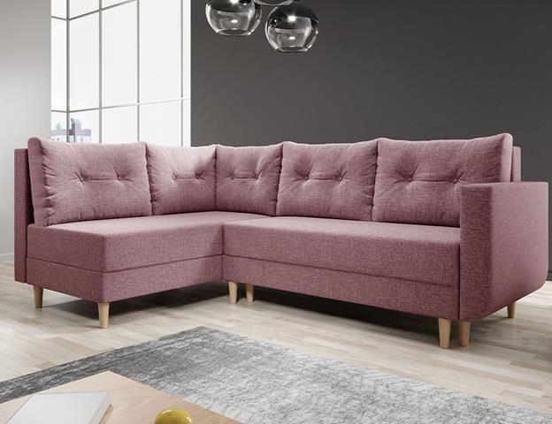 Jego klasyczna linia oparta jest na wysokich nóżkach z drewna bukowego. Dzięki temu bryła nabiera wizualnej lekkości i ułatwia utrzymanie porządku pod meblem. Kształt litery L naturalnie wyznacza strefę wypoczynku w pokoju dziennym. Co ważne, tapicerowany tył pozwala na dowolne ustawienie narożnika, nawet na środku pomieszczenia. Odcień pudrowego różu nadaje wnętrzu unikalny, przytulny charakter. Doskonale pasuje do aranżacji klasycznych oraz nowoczesnych, wnosząc do nich powiew świeżości.