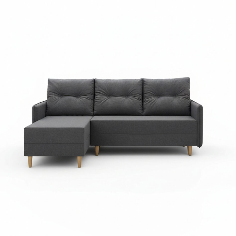 Wysoki komfort wypoczynku to zasługa siedziska wypełnionego sprężynami bonellowymi oraz pianką. Trzy duże poduszki oparciowe zapewniają wygodne podparcie pleców podczas wieczornego relaksu z książką. Narożnik rozkłada się za pomocą prostego w obsłudze systemu DL. Dzięki temu można w kilka chwil przygotować komfortowe miejsce do spania dla gości. Z kolei praktyczny pojemnik na pościel ułatwia przechowywanie tekstyliów i utrzymanie porządku na co dzień.
