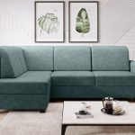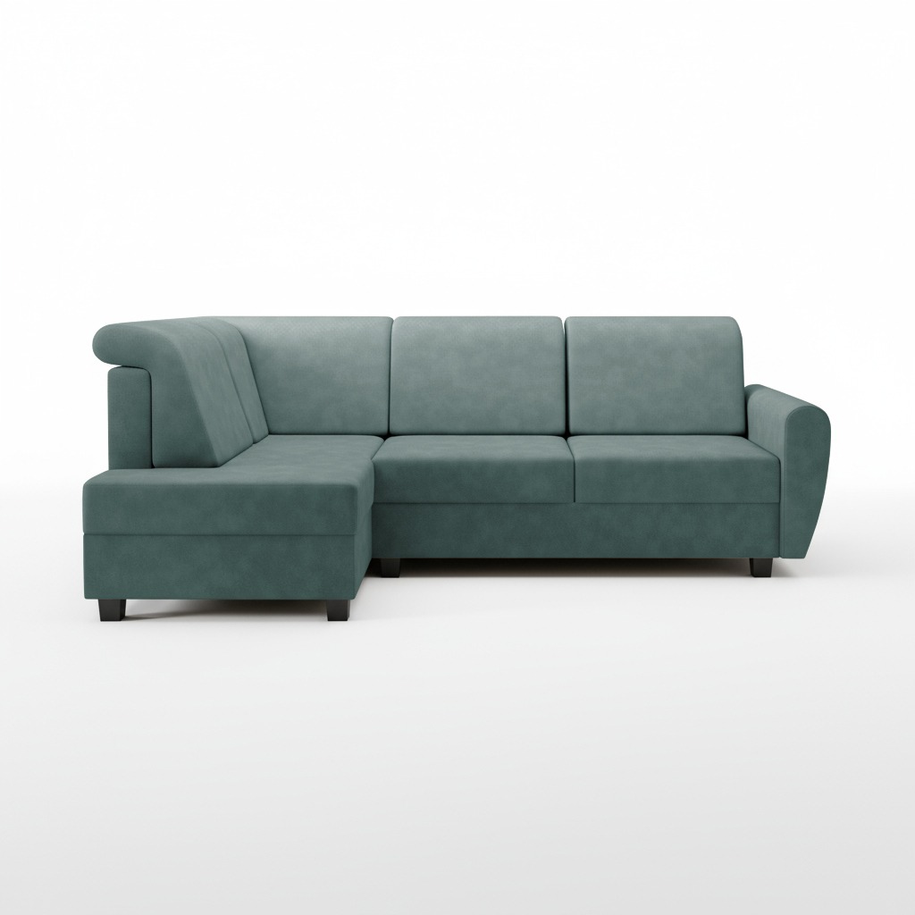 Mebel wyróżnia się prostą, geometryczną formą w kształcie litery L. Dzięki temu doskonale wpisuje się w aranżacje nowoczesne oraz minimalistyczne. Jego wyjątkowy, miętowy kolor wprowadza do wnętrza atmosferę spokoju i lekkości. Ta delikatna barwa ożywia przestrzeń, nadając jej pogodny i optymistyczny charakter. Konstrukcja spoczywa na niskich, drewnianych nóżkach w kolorze wenge, które stanowią elegancki akcent. Co ważne, tapicerowany tył pozwala na ustawienie mebla w dowolnym miejscu salonu.