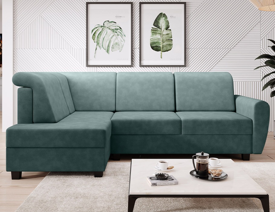 Orzeźwiający, miętowy narożnik Milo z łatwością stanie się centrum życia rodzinnego. Stworzy w salonie atmosferę pełną dobrej energii i naturalnego spokoju, stając się ulubionym miejscem na chwile wytchnienia.