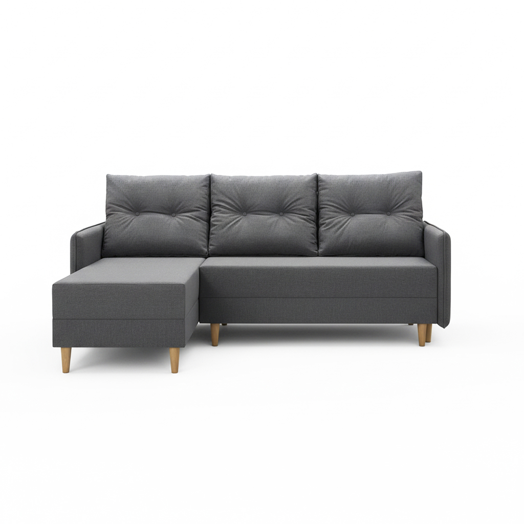 Wygodę podczas codziennego wypoczynku gwarantuje siedzisko wypełnione sprężynami bonellowymi i elastyczną pianką. Zapewnia ono stabilne oraz komfortowe podparcie przez długie lata. Narożnik wyposażono także w intuicyjną funkcję spania. Wystarczy kilka prostych ruchów, aby przygotować dodatkowe miejsce do snu dla gości lub na popołudniową drzemkę. Co ważne, pod siedziskiem ukryto pojemny schowek. Można w nim przechować pościel, koce lub inne domowe tekstylia.