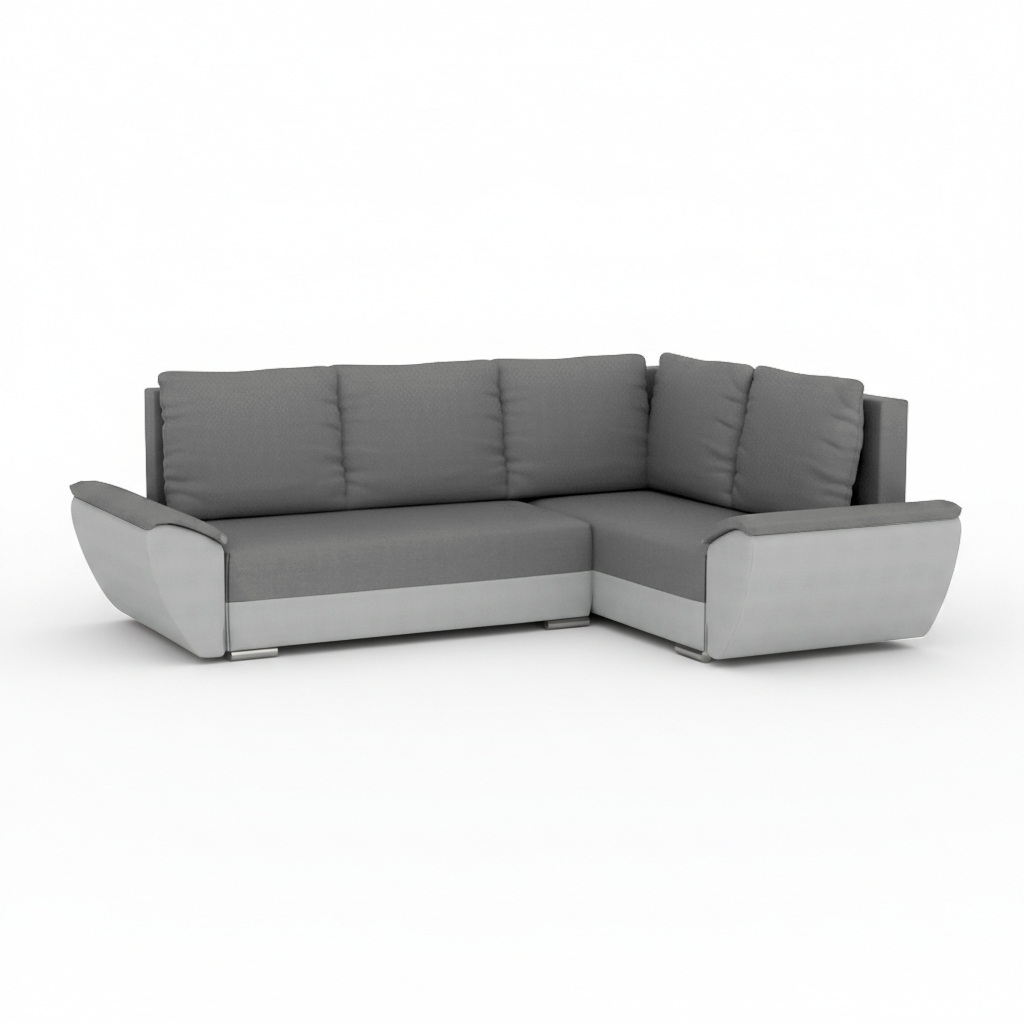 Jego uniwersalny kształt w formie litery L doskonale wpasuje się w przestrzeń każdego salonu. Subtelna szarość obicia wprowadza do wnętrza spokój i elegancję. Dlatego mebel świetnie odnajduje się w aranżacjach nowoczesnych oraz klasycznych. W pełni tapicerowany tył pozwala ustawić go w dowolnym miejscu. Co ważne, całość wspiera się na niskich, chromowanych nóżkach, które dodają bryle lekkości i dyskretnego blasku.
