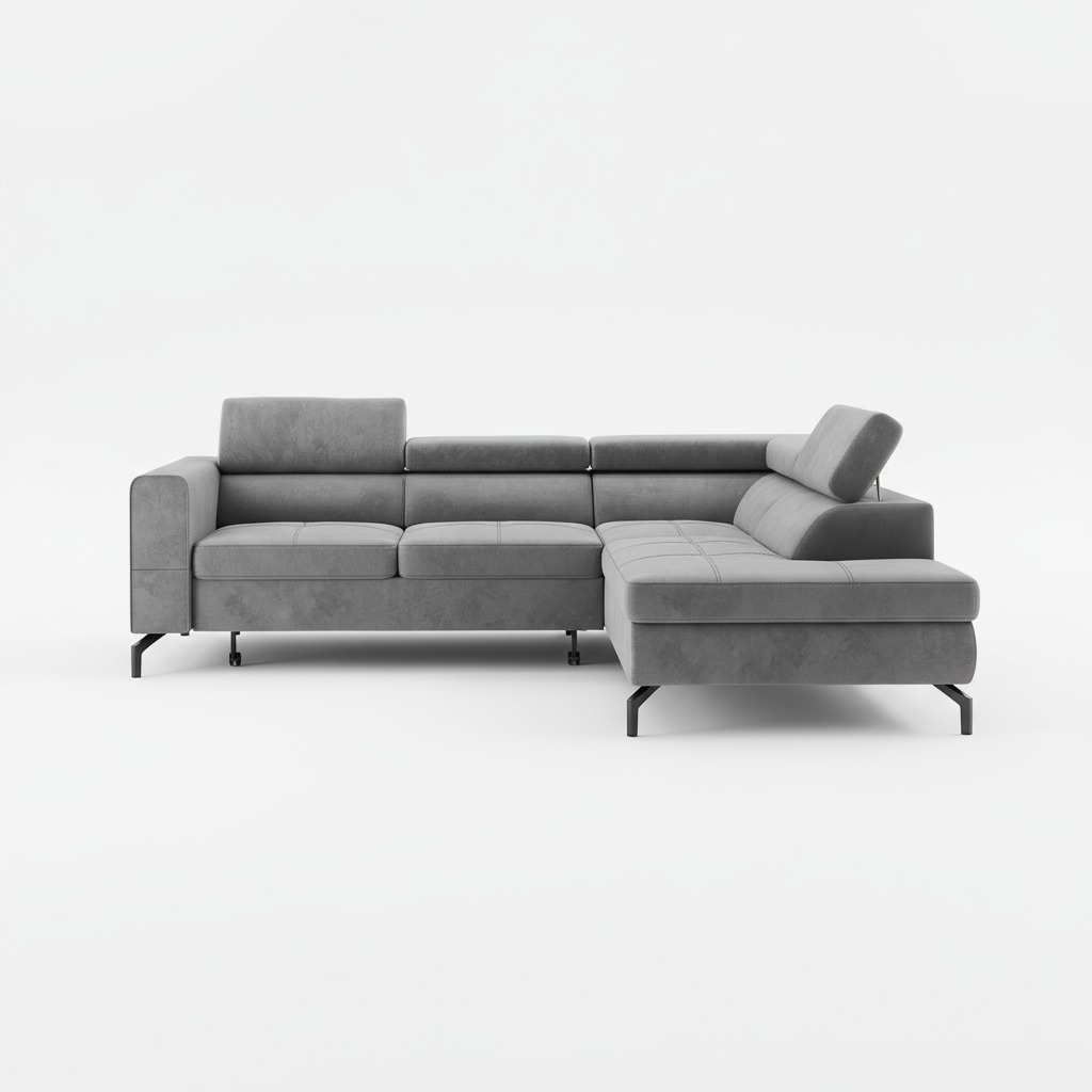 Jego prosta, geometryczna forma opiera się na wysokich, czarnych nóżkach z metalu. Nadają one bryle wizualnej lekkości. Układ w kształcie litery L naturalnie organizuje przestrzeń w salonie. Tworzy idealne miejsce do spotkań lub odpoczynku. Szary kolor tapicerki jest uniwersalny. Dlatego świetnie komponuje się zarówno z nowoczesnymi, jak i klasycznymi aranżacjami.