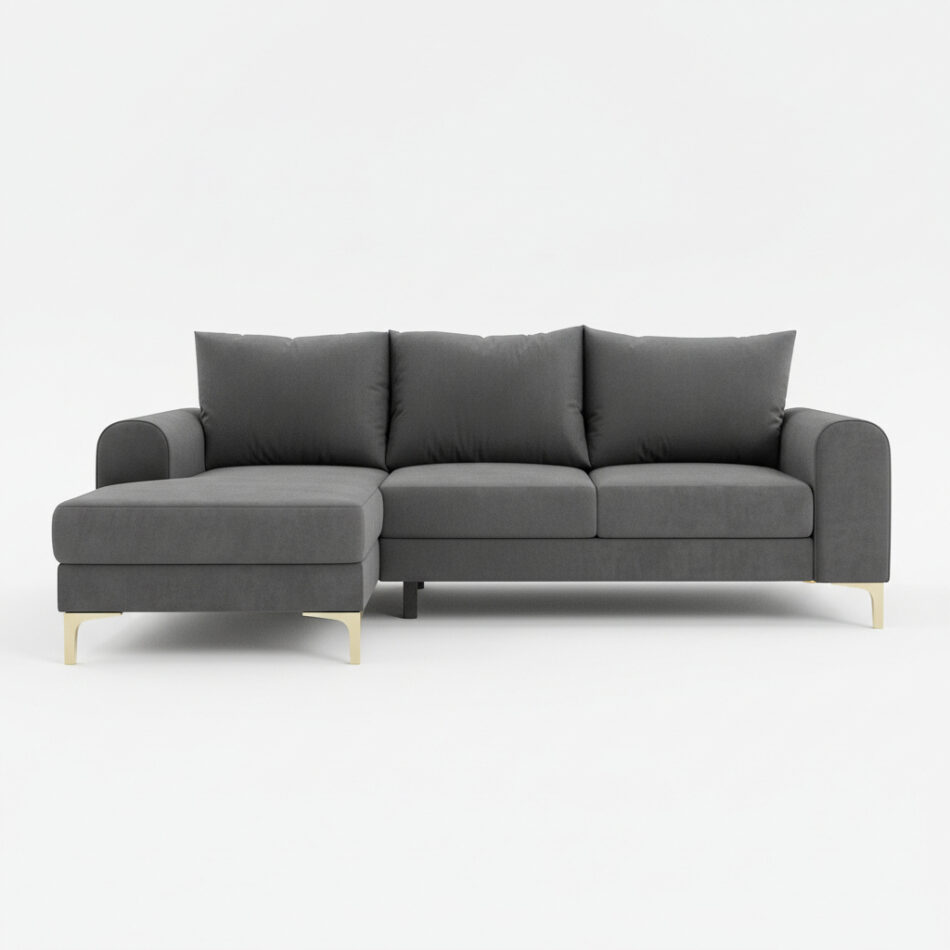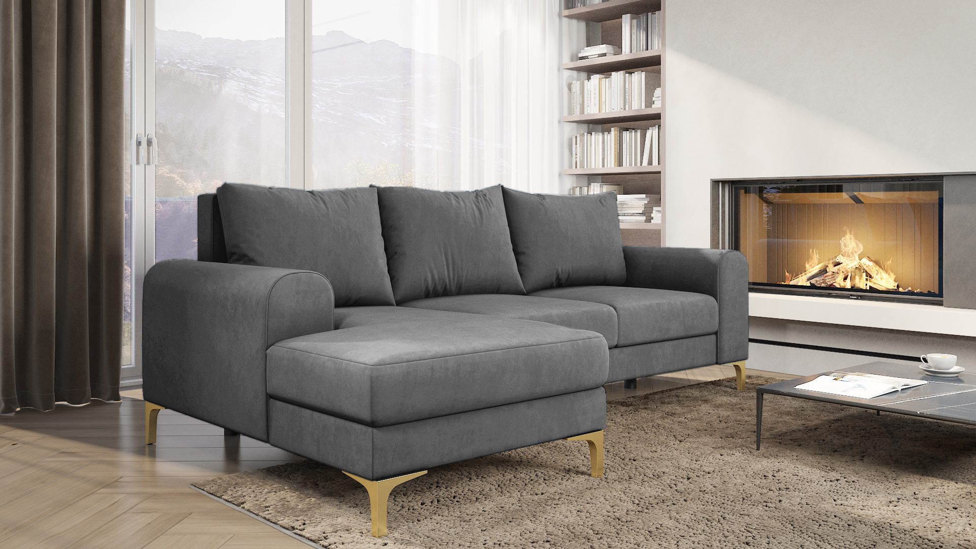 Jego forma w kształcie litery L idealnie organizuje przestrzeń w salonie. Świetnie odnajduje się we wnętrzach urządzonych w stylu nowoczesnym lub boho. Wysokie, czarne nóżki dodają konstrukcji wizualnej lekkości. Co ważne, tapicerowany tył mebla pozwala na ustawienie go w dowolnym miejscu pokoju. Szlachetny, szary odcień tkaniny wprowadza do wnętrza atmosferę spokoju i elegancji. Stanowi też uniwersalną bazę dla kolorowych dodatków.