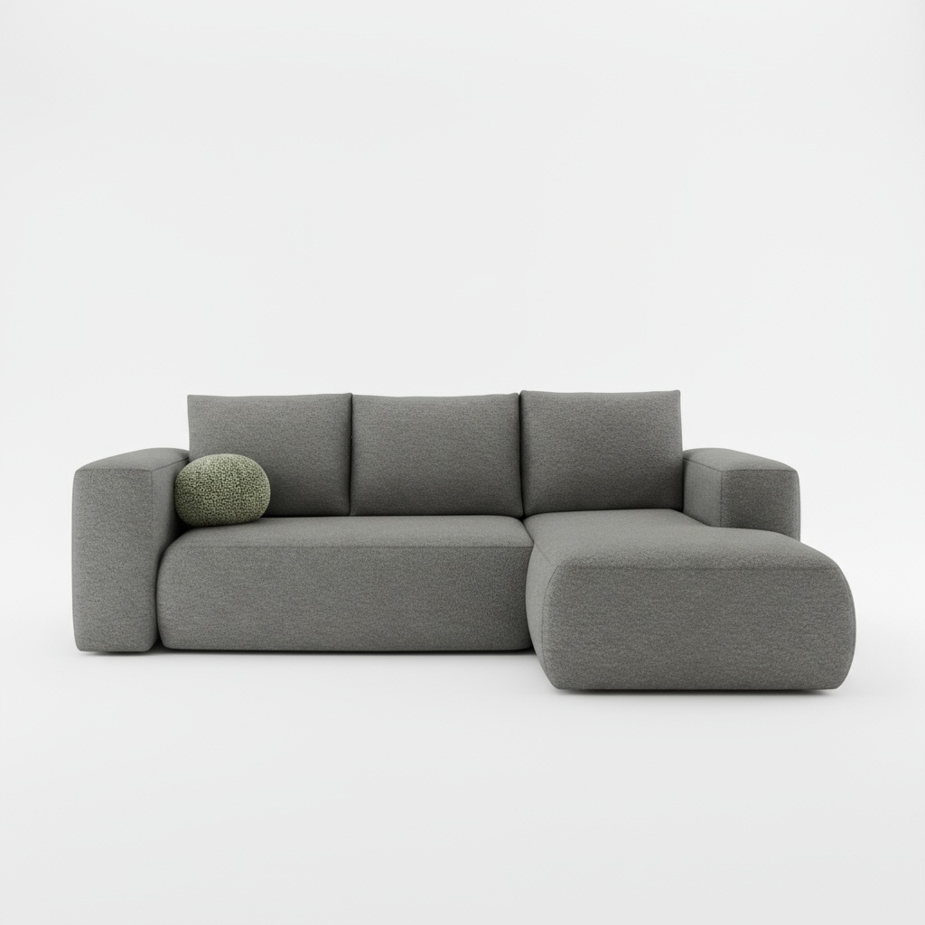 Mebel w kształcie litery L idealnie organizuje przestrzeń w pokoju dziennym. Jego uniwersalna bryła świetnie odnajduje się we wnętrzach nowoczesnych oraz inspirowanych stylem boho. Szary odcień tapicerki jest przy tym niezwykle elegancki. Stanowi doskonałą bazę dla kolorowych dodatków. Co ważne, tapicerowany tył pozwala ustawić narożnik w dowolnym miejscu salonu, nawet na jego środku.