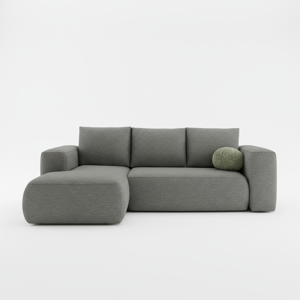 Jego nowoczesna bryła w kształcie litery L świetnie komponuje się z wnętrzami w stylu boho lub minimalistycznym. Szlachetny szary odcień tworzy w salonie spokojną i elegancką atmosferę. Stanowi dzięki temu doskonałą bazę dla drewnianych mebli i żywych, kolorowych akcentów. Co ważne, tapicerowany tył pozwala ustawić mebel w dowolnym miejscu. Można nim subtelnie oddzielić strefę wypoczynku od reszty pomieszczenia.