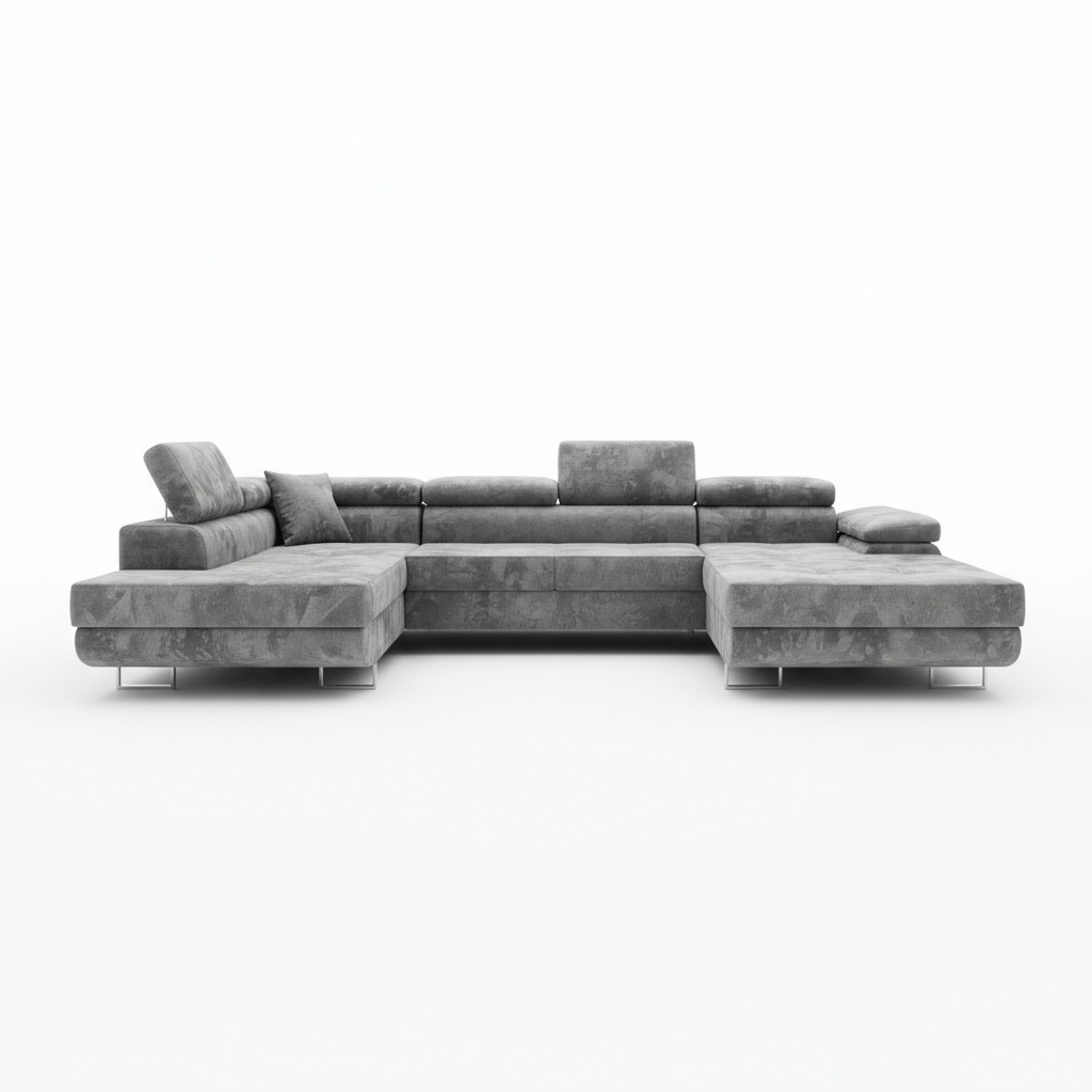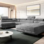 Jego imponujący kształt litery U tworzy idealną przestrzeń do wspólnych spotkań z rodziną i przyjaciółmi. Uniwersalna szarość obicia doskonale komponuje się z różnymi aranżacjami. Pasuje zarówno do wnętrz minimalistycznych, jak i tych z industrialnym charakterem. Smukłe, chromowane nóżki dodają całej konstrukcji wizualnej lekkości. Co ważne, tapicerowany tył pozwala na ustawienie mebla w dowolnym miejscu salonu, czyniąc go centralnym punktem wystroju.