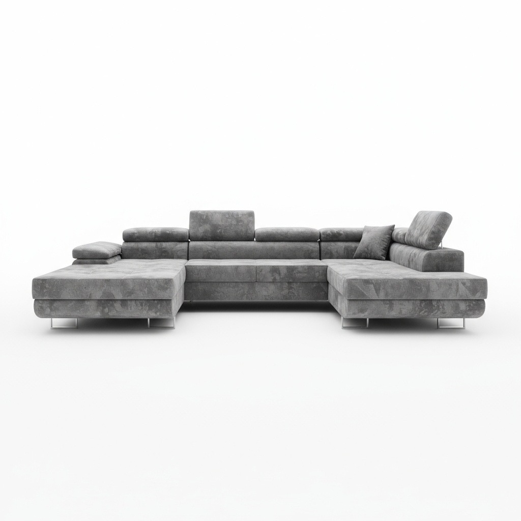 Jego symetryczny układ tworzy idealne miejsce do rodzinnych spotkań i relaksu w większym gronie. Nowoczesną bryłę mebla osadzono na wysokich, chromowanych nóżkach. Nadają one całej konstrukcji wizualnej lekkości. Co ważne, tapicerowany tył pozwala ustawić narożnik w dowolnym miejscu salonu, nawet na jego środku. Szary kolor tapicerki wprowadza do pomieszczenia atmosferę spokoju. Stanowi doskonałą bazę dla wielu aranżacji, od minimalistycznych po bardziej wyraziste.