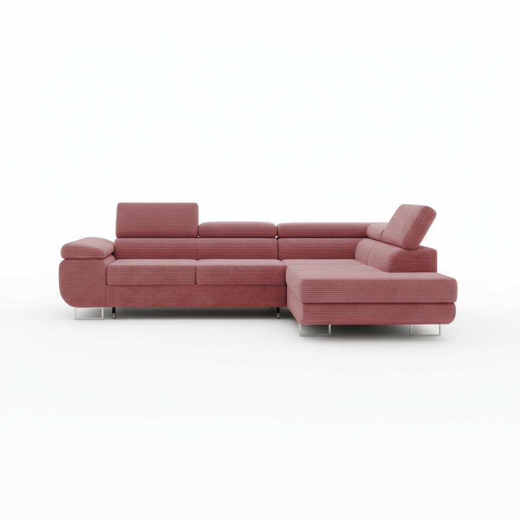 Wygodne siedzisko wypełnione sprężynami falistymi i pianką zapewnia optymalne wsparcie. Dlatego narożnik jest idealnym miejscem na popołudniową drzemkę lub wieczór z książką. Regulowane zagłówki pozwalają dopasować oparcie do indywidualnych potrzeb. Wystarczy chwila, by przygotować miejsce dla gości. Rozkładanie za pomocą automatu Delfin jest proste i nie wymaga wysiłku. Duży pojemnik na pościel pomaga z kolei utrzymać porządek w salonie.