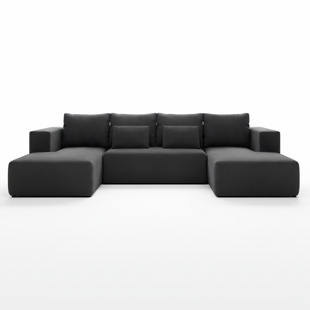 Jego rozłożysty kształt w formie litery U tworzy idealne miejsce do spotkań z rodziną i przyjaciółmi. Ten model staje się naturalnym centrum domowego życia, gdzie każdy znajdzie dla siebie wygodny kąt. Głęboki, grafitowy kolor tapicerki wprowadza do wnętrza atmosferę elegancji i spokoju. Dlatego doskonale pasuje do aranżacji nowoczesnych oraz tych inspirowanych stylem boho. Ten szlachetny odcień stanowi świetną bazę dla kolorowych dodatków, pozwalając na swobodę w dekorowaniu salonu.