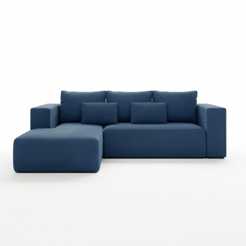 Jego klasyczna forma w kształcie litery L doskonale wpisuje się w nowoczesne i tradycyjne aranżacje. Głęboki granatowy odcień wprowadza do salonu atmosferę spokoju i elegancji. Staje się on wyrazistym akcentem, który pięknie komponuje się z jasnymi ścianami lub naturalnym drewnem. Co ważne, tapicerowany tył mebla pozwala na swobodne ustawienie go w dowolnym miejscu. Dzięki temu narożnik może stać się centralnym punktem pokoju dziennego.