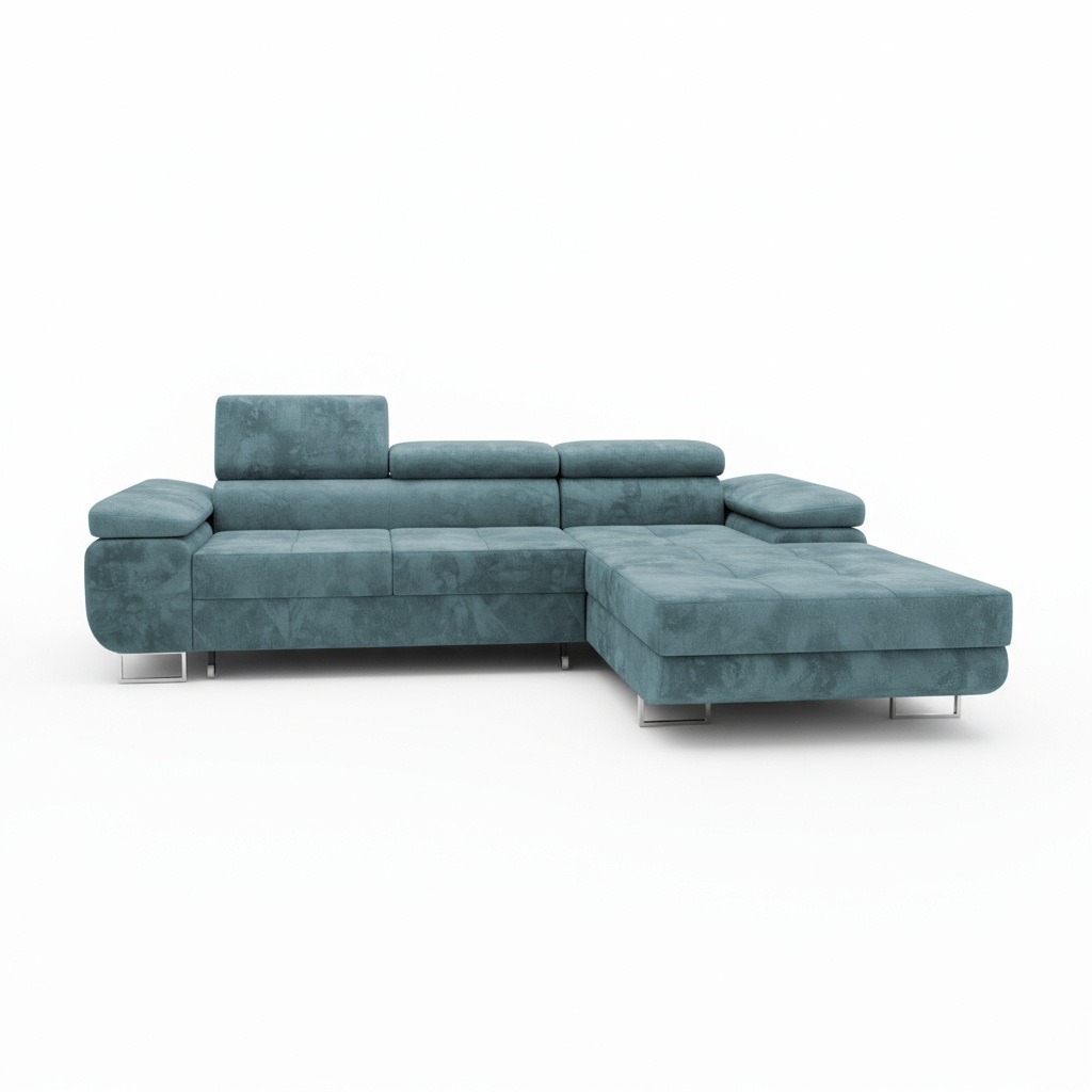Jego wyrazista linia w kształcie litery L doskonale komponuje się z wysokimi, chromowanymi nóżkami. Nadaje to całej konstrukcji wizualnej lekkości. Głęboki, turkusowy odcień tapicerki wprowadza do salonu energię i powiew świeżości. Staje się on centralnym punktem aranżacji, idealnie pasującym do wnętrz nowoczesnych oraz eklektycznych. Co ważne, tapicerowany tył pozwala swobodnie ustawić narożnik w dowolnym miejscu, nawet na środku pokoju.