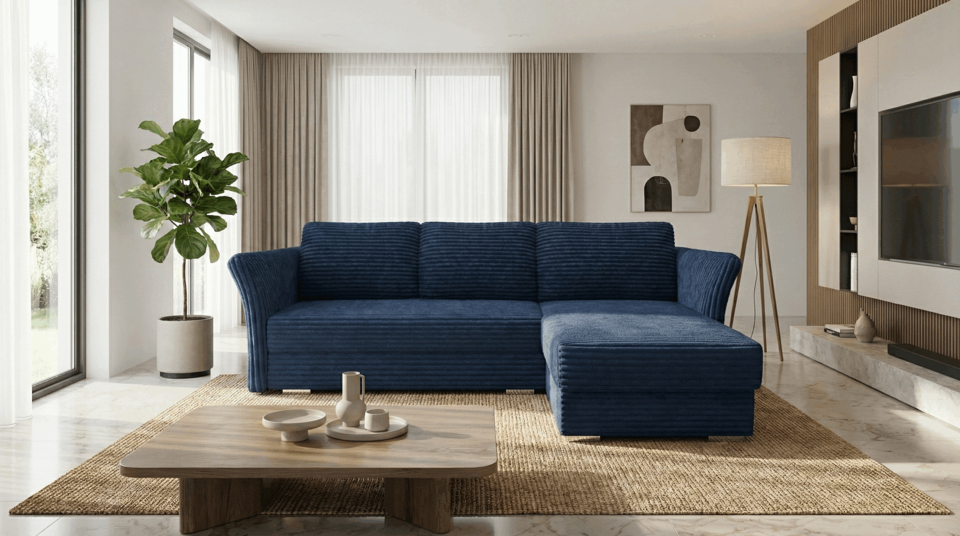 Jego klasyczny kształt w formie litery L idealnie wpasuje się w przestrzeń salonu. Niskie, chromowane nóżki dodają mu lekkości oraz nowoczesnego charakteru. Głęboki, granatowy kolor obicia wprowadza do pomieszczenia atmosferę spokoju i wyrafinowania. Dlatego świetnie komponuje się z drewnianymi dodatkami lub metalicznymi akcentami, tworząc spójną aranżację.