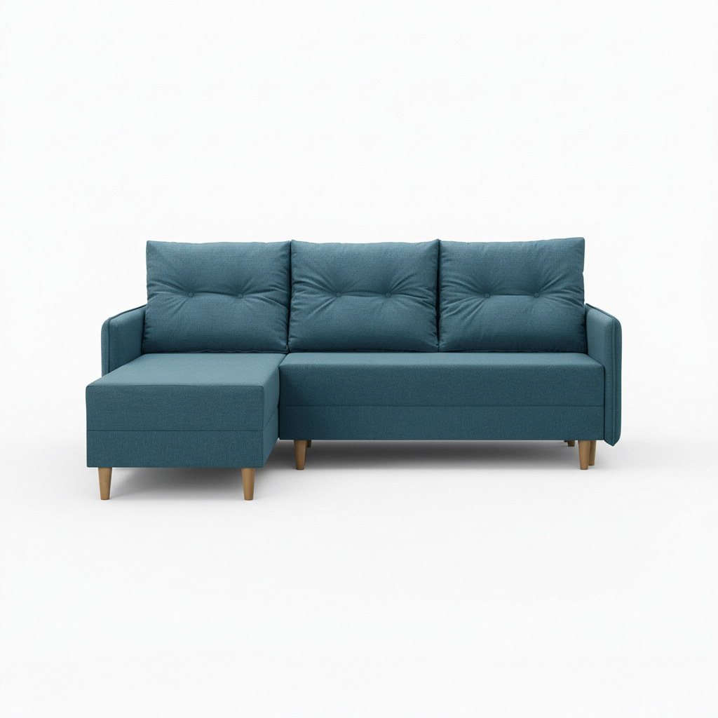 Jego forma w literze L doskonale organizuje przestrzeń w salonie. Wysokie nóżki z drewna bukowego dodają konstrukcji wizualnej lekkości. Umożliwiają też wygodne sprzątanie pod meblem. Głęboki, turkusowy odcień wprowadza do wnętrza energię i powiew świeżości. Dzięki niemu aranżacja staje się wyrazista i niepowtarzalna. Co ważne, tapicerowany tył pozwala ustawić narożnik w dowolnym miejscu, nawet na środku pokoju.