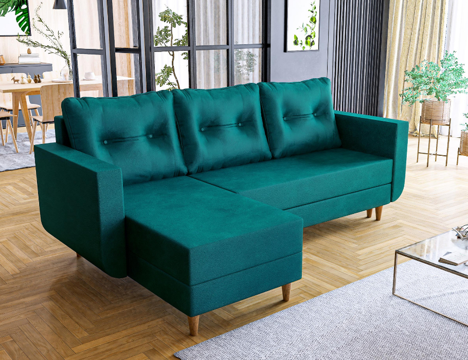 Jego L-kształtna konstrukcja doskonale organizuje przestrzeń w salonie. Głęboki turkusowy odcień wnosi do wnętrza energię i powiew świeżości. Dlatego mebel świetnie pasuje zarówno do aranżacji nowoczesnych, jak i tych inspirowanych klasyką. Całość wspiera się na wysokich, drewnianych nóżkach w kolorze buku. Dzięki temu bryła nabiera wizualnej lekkości. Tapicerowany tył pozwala na ustawienie narożnika w dowolnym miejscu, nawet na środku pokoju.