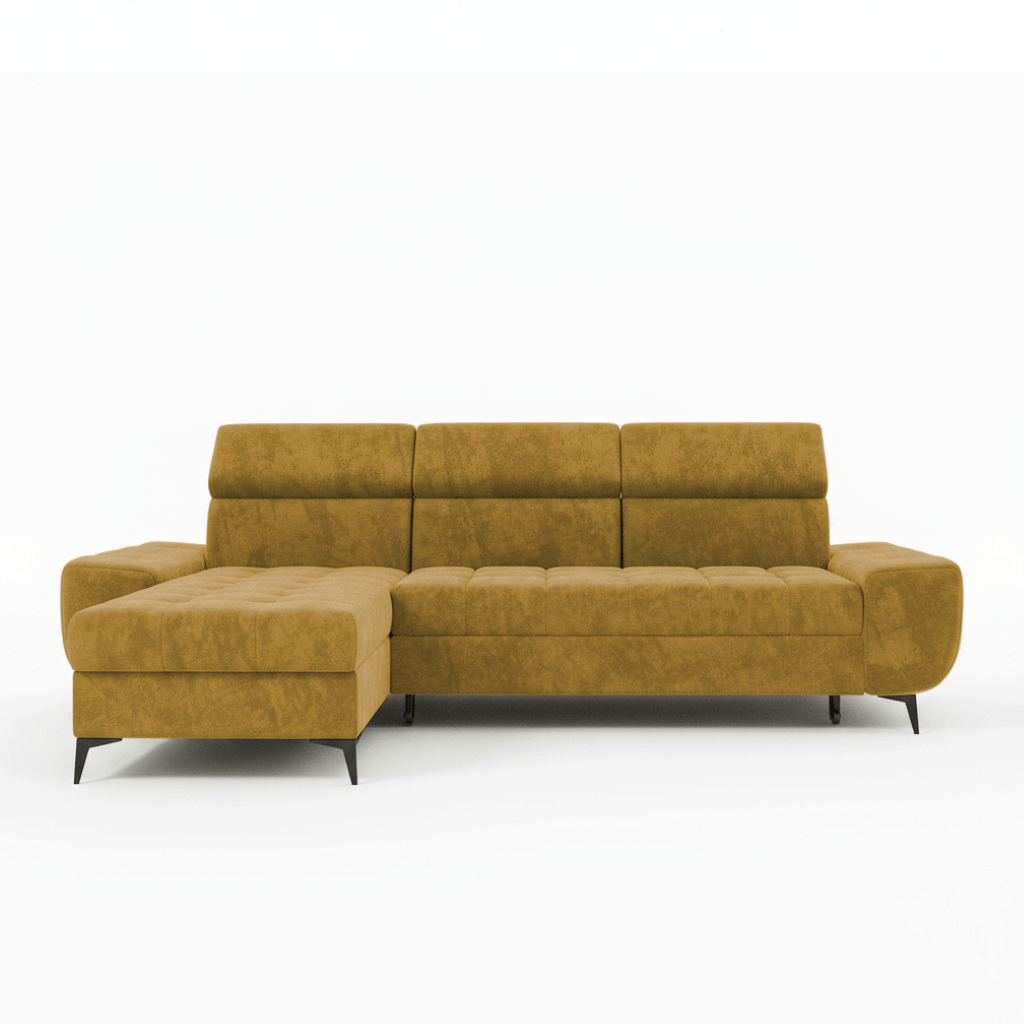 Model ten ma nowoczesny, L-kształtny układ. Dlatego świetnie organizuje przestrzeń w salonie. Jego ciepły, musztardowy odcień wprowadza do pomieszczenia mnóstwo pozytywnej energii. Wspaniale ożywia minimalistyczne aranżacje lub dopełnia wnętrza w stylu retro. Wysokie, czarne nóżki dodają sylwetce lekkości. Co ważne, tapicerowany tył mebla pozwala ustawić go w dowolnym miejscu, nawet na środku pokoju.