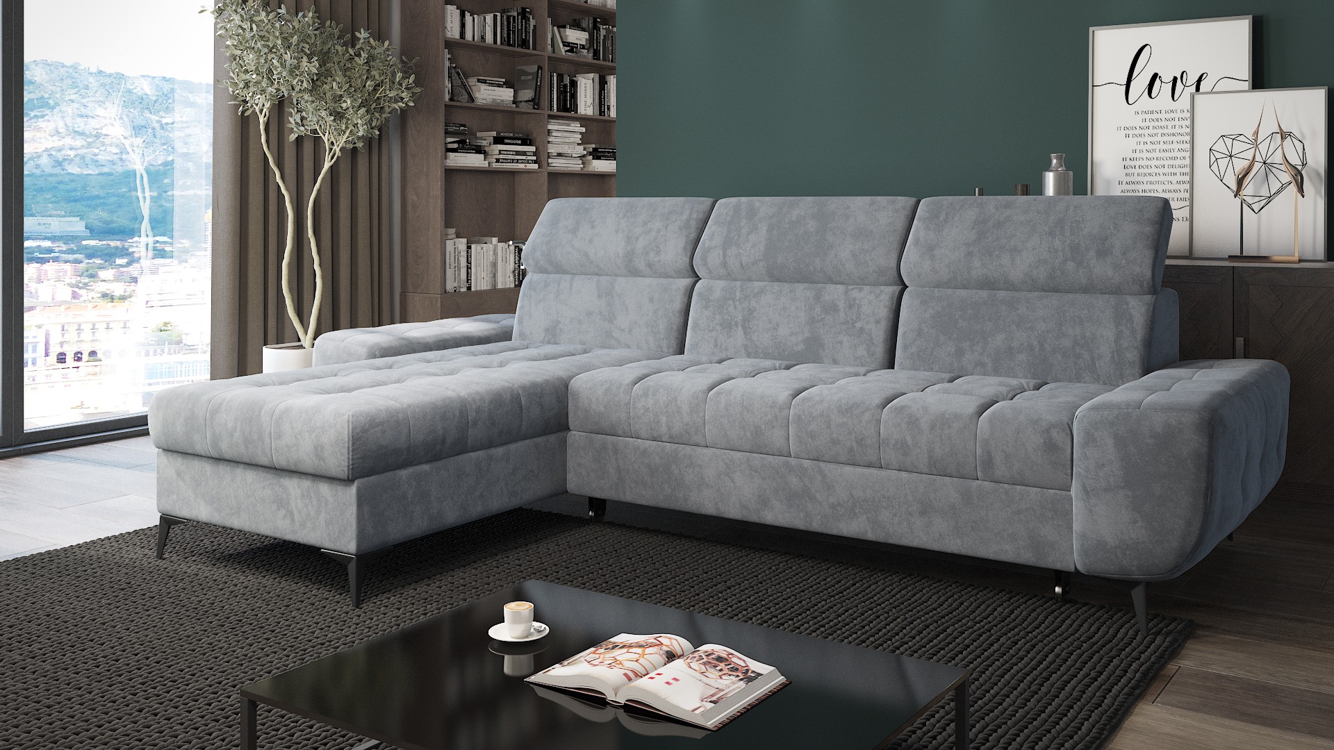 Model ten został zaprojektowany z myślą o codziennej wygodzie domowników. Regulowane zagłówki pozwalają na idealne dopasowanie podparcia podczas czytania książki lub wieczornego seansu filmowego. Siedzisko wypełniają sprężyny faliste oraz elastyczna pianka. Zapewnia to stabilne i komfortowe podparcie w trakcie odpoczynku po długim dniu. Wieczorem narożnik można bez trudu zamienić w wygodne miejsce do spania dla gości. Rozkładanie za pomocą automatu Delfin jest intuicyjne i nie wymaga wysiłku.