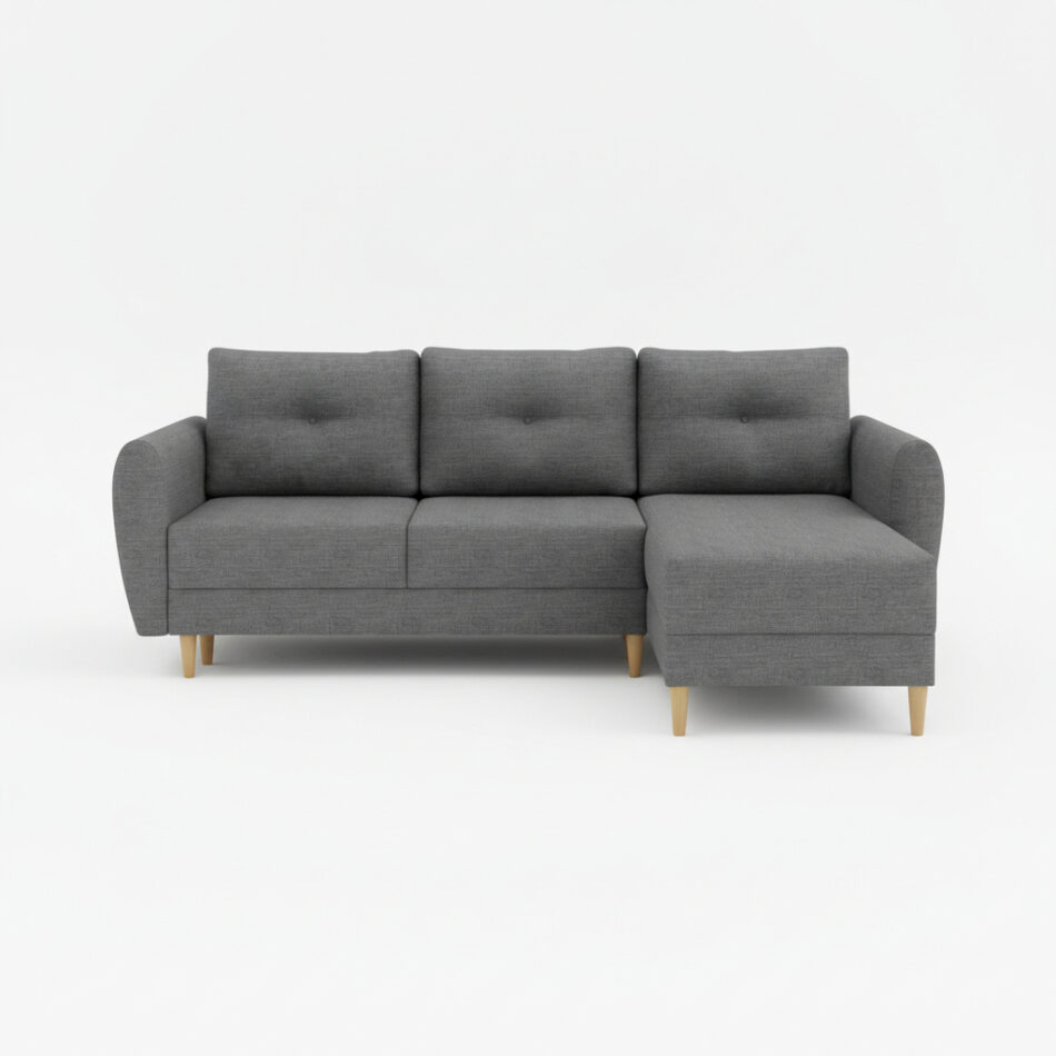 Jego klasyczna forma w kształcie litery L opiera się na wysokich, drewnianych nóżkach w kolorze naturalnego buku. Nadają one całej bryle wizualnej lekkości. Głęboki, ciemnoszary odcień tapicerki jest niezwykle uniwersalny. Dlatego doskonale pasuje do wnętrz nowoczesnych i minimalistycznych. Co ważne, tył mebla również pokryto tkaniną. Dzięki temu narożnik może stanąć w centralnym punkcie salonu, subtelnie wyznaczając strefę relaksu.