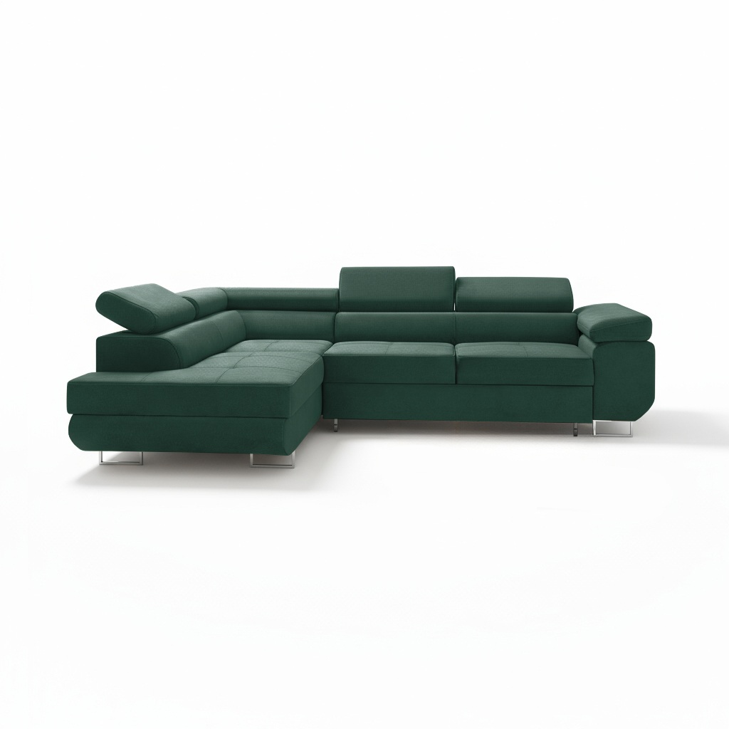 Jego nowoczesna bryła opiera się na wysokich, chromowanych nóżkach. Nadają one konstrukcji wizualnej lekkości. Głęboki odcień butelkowej zieleni tworzy w salonie przytulny, a jednocześnie wyrazisty klimat. Dlatego narożnik Avesta doskonale odnajdzie się zarówno w minimalistycznych, jak i bardziej odważnych aranżacjach. Obicie z weluru jest niezwykle przyjemne w dotyku. Co ważne, tapicerowany tył pozwala na ustawienie mebla w dowolnym miejscu, nawet na środku pokoju.