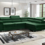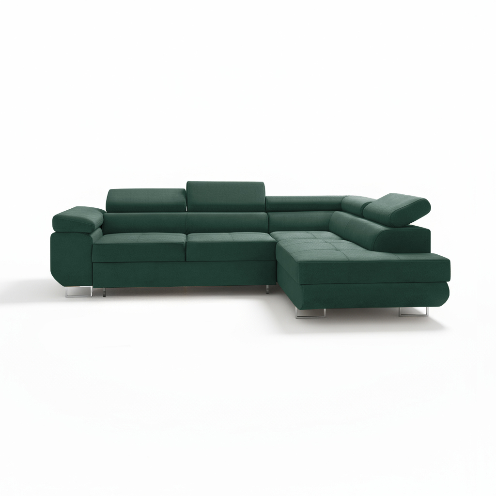 Jego przemyślany układ w kształcie litery L naturalnie wyznacza strefę wypoczynku w salonie. Głęboki odcień butelkowej zieleni wprowadza do wnętrza nastrój spokoju i dyskretnej elegancji. Dlatego mebel wspaniale komponuje się z elementami drewna, czerni czy złotych dodatków. Smukłe, chromowane nóżki dodają mu wizualnej lekkości, a tapicerowany tył pozwala swobodnie zaaranżować go nawet na środku pokoju.