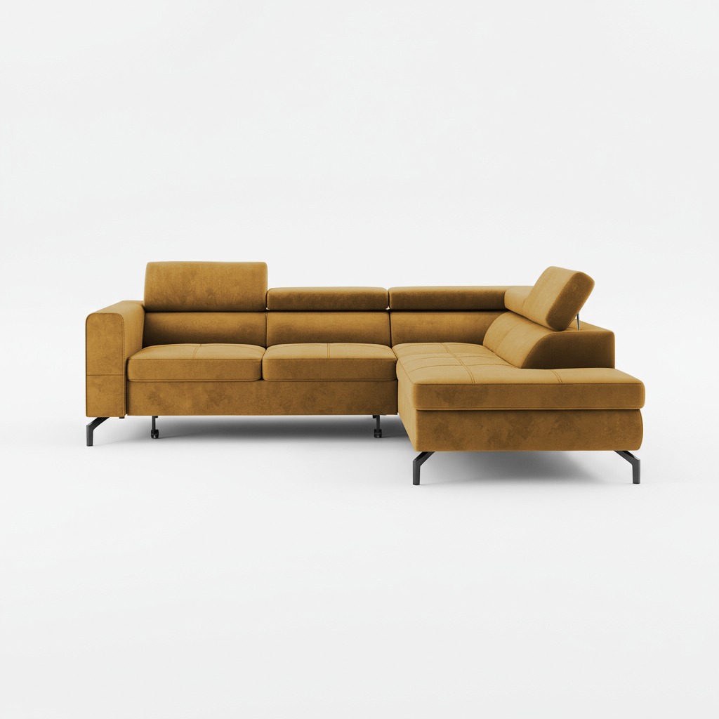 Jego nowoczesna bryła w kształcie litery L opiera się na smukłych, czarnych nóżkach. Nadają one całej konstrukcji wizualnej lekkości. Intensywny musztardowy odcień staje się wyrazistym akcentem we wnętrzu. Ożywia aranżacje w stylu klasycznym lub nowoczesnym. Dzięki temu salon zyskuje niepowtarzalny charakter pełen optymizmu. Co ważne, tapicerowany tył pozwala swobodnie ustawić mebel w dowolnym miejscu. Może on stać się centralnym punktem otwartej przestrzeni dziennej.