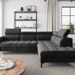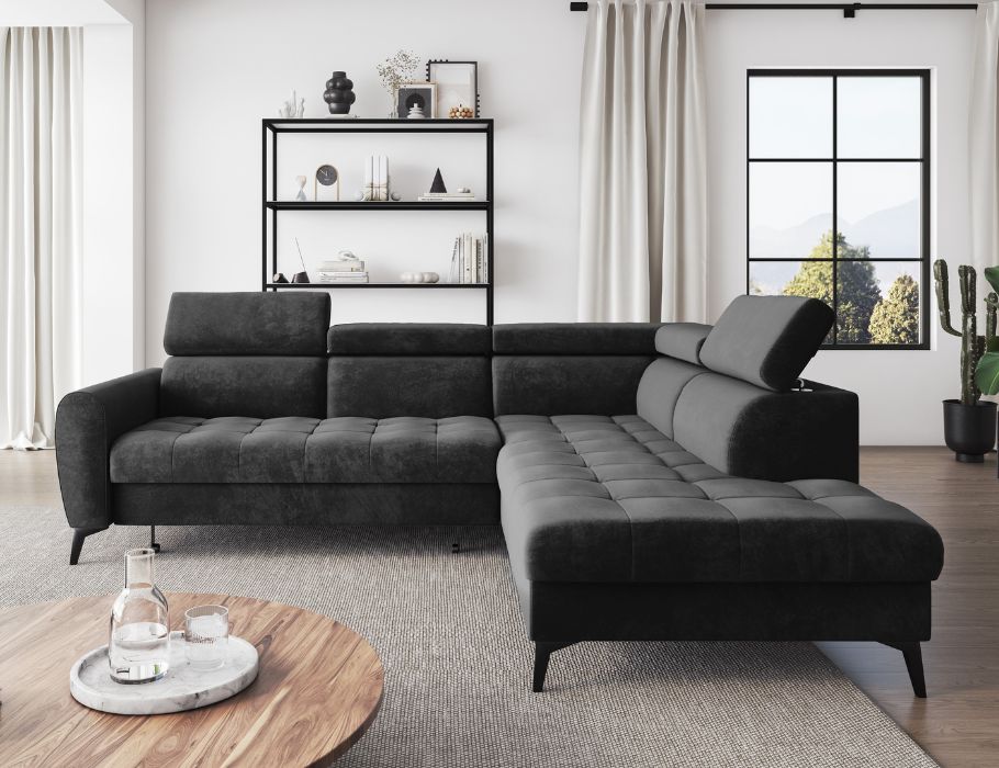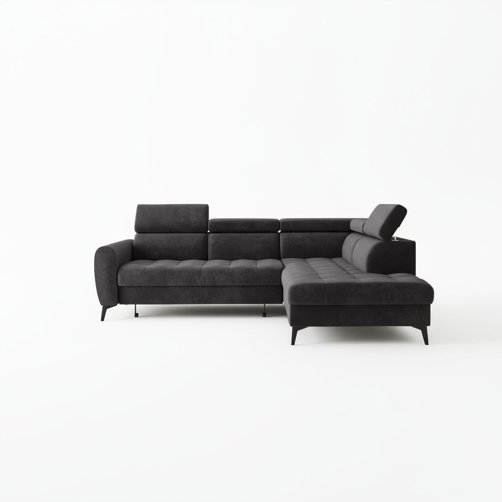 Przemyślany układ w kształcie litery L sprzyja wspólnemu spędzaniu czasu. Grafitowy kolor tkaniny tworzy w pomieszczeniu stonowaną, elegancką bazę. Idealnie komponuje się z drewnem, bielą lub mocniejszymi akcentami kolorystycznymi, nadając wnętrzu wyrafinowany charakter. Siedzisko wypełnione sprężynami falistymi oraz pianką zapewnia stabilne podparcie i przyjemną miękkość. Dzięki temu codzienne użytkowanie jest zawsze komfortowe. Z kolei po długim dniu pracy regulowane zagłówki pozwalają idealnie dopasować wysokość oparcia do indywidualnych potrzeb, gwarantując pełne odprężenie.