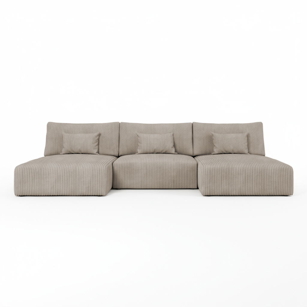 Jego symetryczny kształt w formie litery U tworzy idealne miejsce do spotkań w rodzinnym gronie. Zapewnia dużo przestrzeni do wspólnego relaksu. Ciepły, beżowy kolor tapicerki wprowadza do wnętrza spokój i przytulną atmosferę. Dlatego narożnik świetnie pasuje do aranżacji w stylu skandynawskim lub minimalistycznym. Co ważne, tapicerowany tył pozwala na ustawienie mebla w dowolnym miejscu salonu. W ten sposób staje się on centralnym punktem domowego życia.