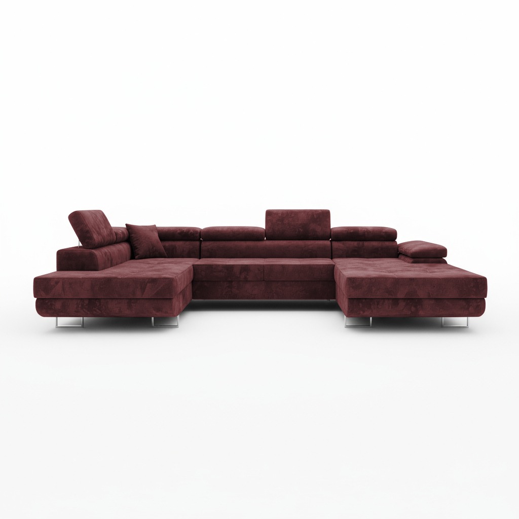 Jego obszerny kształt naturalnie wyznacza centrum domowego życia, tworząc idealne miejsce do spotkań w większym gronie. Nasycona barwa bordo nadaje aranżacji wyrafinowany i jednocześnie ciepły charakter. Dlatego świetnie odnajduje się we wnętrzach klasycznych oraz nowoczesnych, dodając im głębi. Całość osadzono na wysokich, chromowanych nóżkach. W ten sposób masywna bryła zyskuje wizualną lekkość i subtelną elegancję.