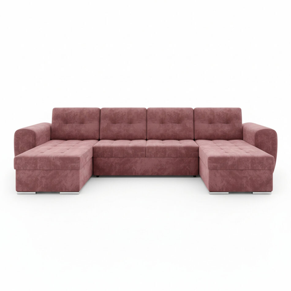 Jego imponujący kształt litery U tworzy idealne miejsce do spotkań z bliskimi. Subtelny odcień różu dodaje wnętrzu ciepła i oryginalnego charakteru. Dlatego mebel świetnie odnajduje się w aranżacjach nowoczesnych oraz klasycznych. Całość wspiera się na niskich, chromowanych nóżkach, które wprowadzają do projektu element lekkości. Co ważne, tapicerowany tył pozwala na ustawienie narożnika w dowolnym miejscu salonu, nie tylko przy ścianie.