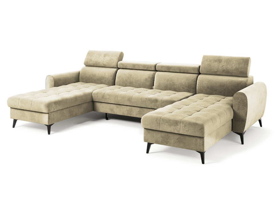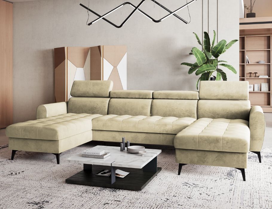 Narożnik Bjorn U wyróżnia się regulowanymi zagłówkami, które umożliwiają dostosowanie kąta oparcia do indywidualnych preferencji. To idealne rozwiązanie dla osób, które cenią sobie wysoki komfort wypoczynku. Pikowane siedziska nadają meblowi elegancji i podkreślają jego nowoczesny charakter.
