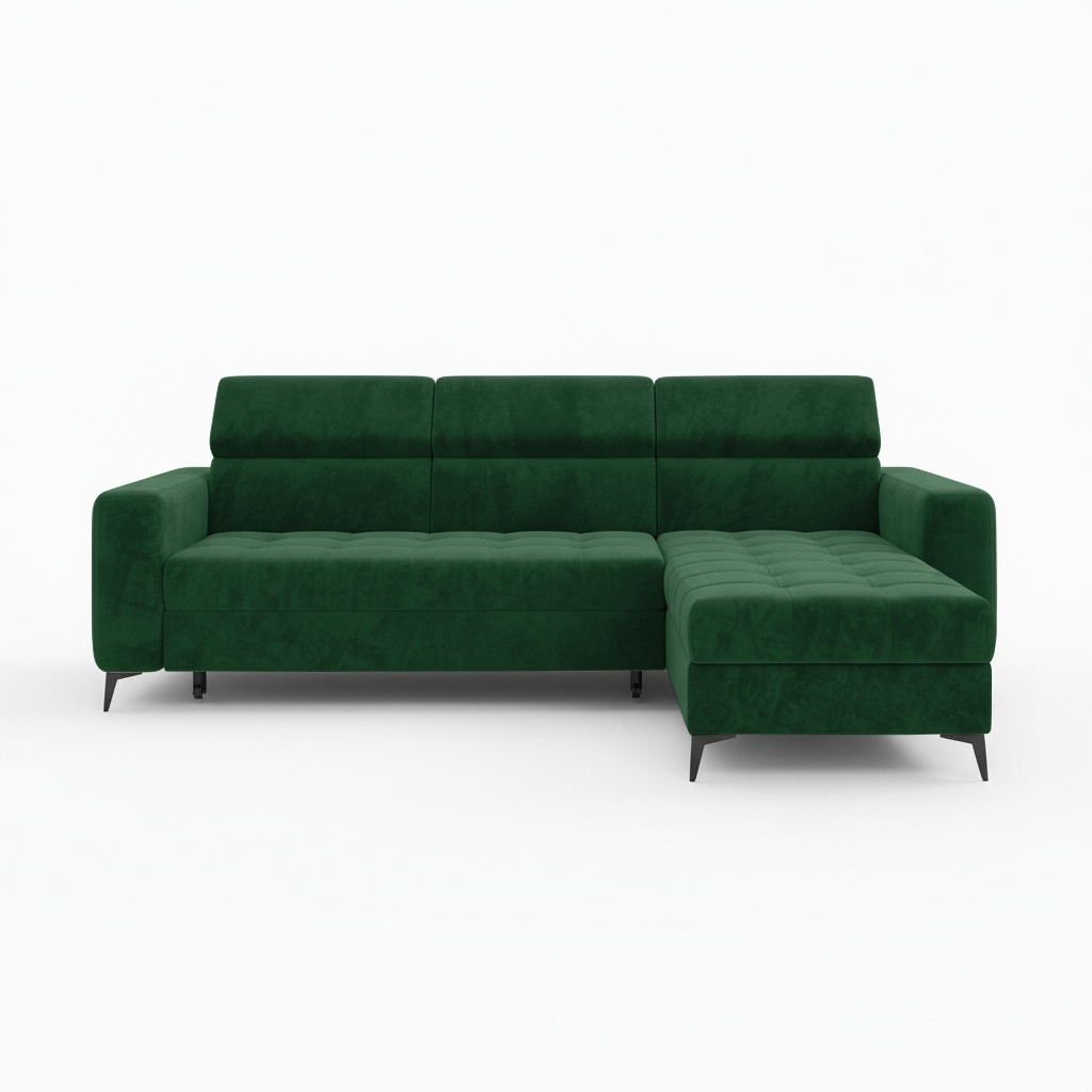 Narożnik Filo jest także przygotowany na wizytę gości. Posiada intuicyjną funkcję spania, rozkładaną za pomocą automatu Delfin. W ten sposób w kilka chwil powstaje wygodna przestrzeń do nocnego odpoczynku. Praktyczny pojemnik na pościel ułatwia zachowanie porządku w salonie. Butelkowozielony welur jest przyjazny zwierzętom. Dlatego ich sierść można łatwo usunąć z powierzchni. Tkanina dodatkowo utrudnia wchłanianie rozlanych płynów, co czyni codzienne użytkowanie bezstresowym.