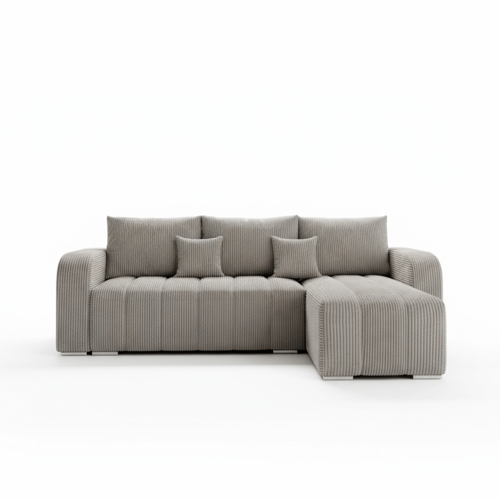 Narożnik wyposażono w intuicyjną funkcję spania typu DL. Dzięki niej mebel w kilka chwil zmienia się w wygodne łóżko dla gości. Praktyczny pojemnik na pościel ukryty w otomanie pomaga utrzymać porządek w salonie. Można w nim schować dodatkowe koce, poduszki lub sezonowe tekstylia.