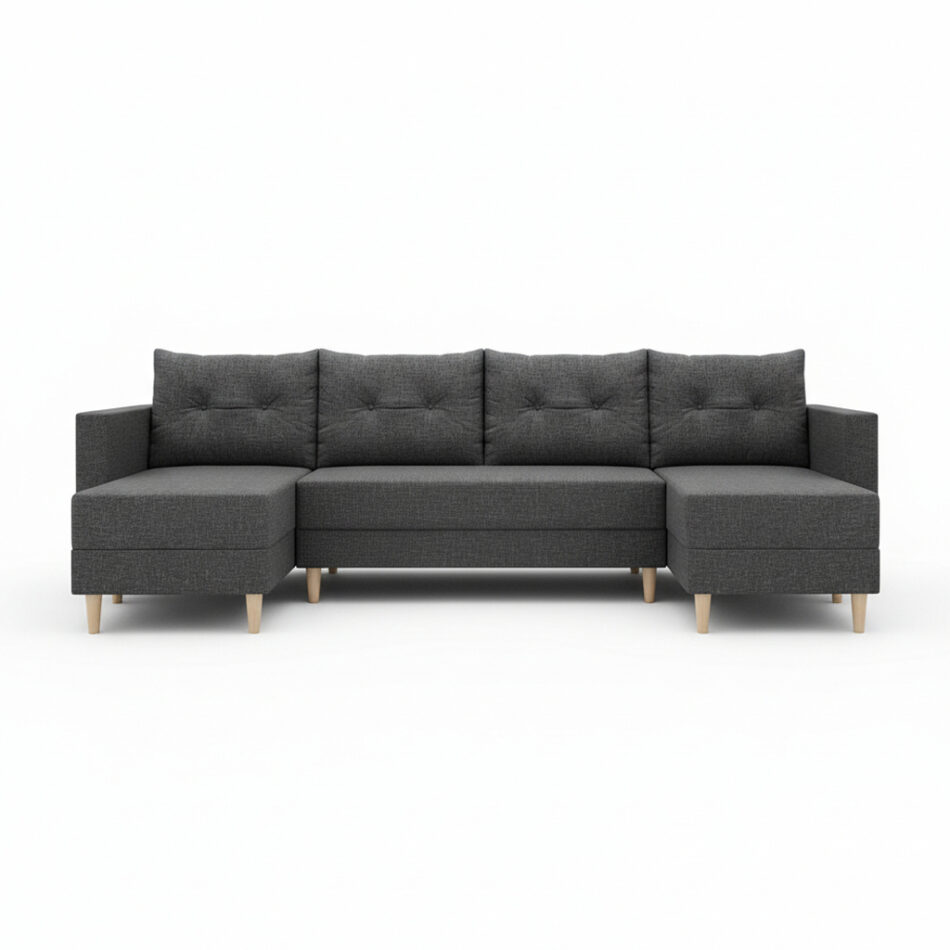 Jego kształt w formie litery U naturalnie tworzy przestrzeń do spotkań z rodziną i przyjaciółmi. Głęboki, ciemnoszary odcień tapicerki nadaje wnętrzu elegancji. Dlatego pasuje zarówno do nowoczesnych, jak i bardziej klasycznych aranżacji. Wysokie nóżki z drewna bukowego dodają bryle wizualnej lekkości. Co ważne, tapicerowany tył pozwala ustawić mebel w dowolnym miejscu salonu, nie tylko przy ścianie.