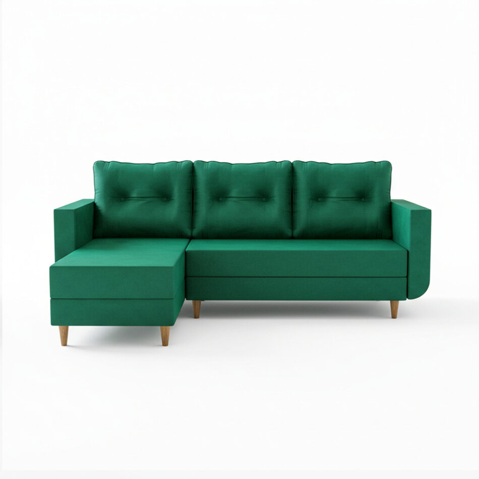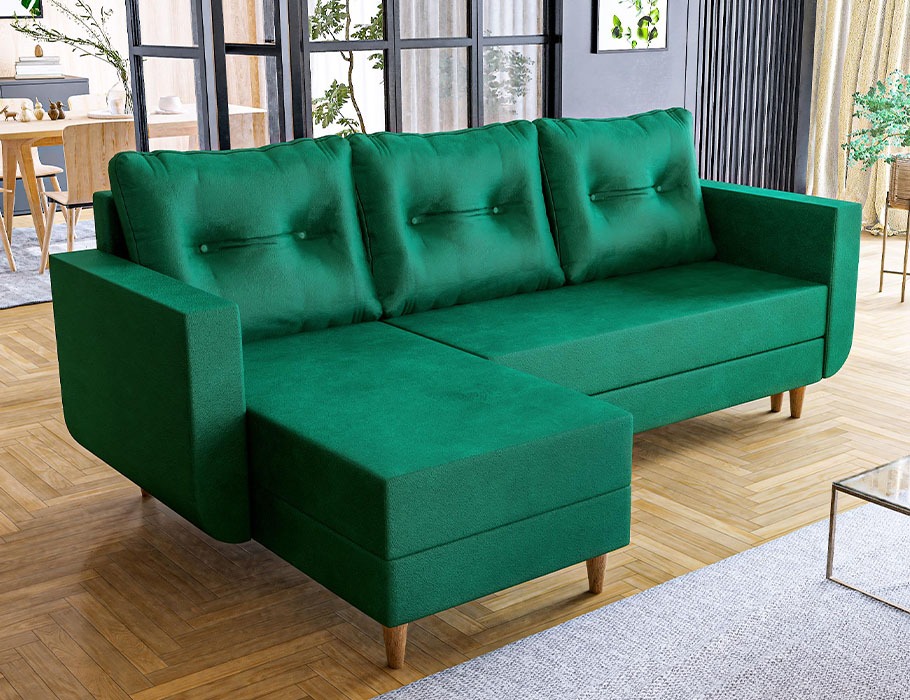 Jego ponadczasowy styl pasuje zarówno do klasycznych, jak i współczesnych aranżacji. Głęboki odcień butelkowej zieleni nadaje przestrzeni szlachetny i przytulny charakter. Kolor ten doskonale komponuje się z drewnem, złotymi dodatkami oraz naturalnymi materiałami. Narożnik w kształcie litery L wspiera się na wysokich nóżkach z drewna bukowego. Dzięki temu bryła zyskuje lekkość, a utrzymanie czystości pod meblem jest niezwykle proste. Co ważne, tapicerowany tył pozwala na ustawienie go w dowolnym miejscu salonu.