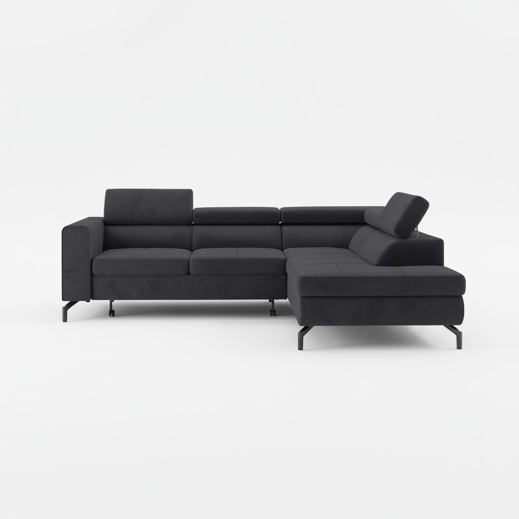 Jego nowoczesna bryła w kształcie litery L doskonale komponuje się z różnymi aranżacjami. Wysokie, czarne nóżki dodają jej wizualnej lekkości. Głęboki grafitowy odcień tapicerki tworzy w salonie atmosferę spokoju i wyrafinowania. Kolor ten stanowi idealną bazę dla dodatków w intensywnych barwach lub stonowanych szarościach.
