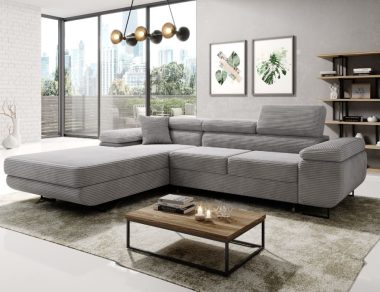 Jego nowoczesna, prosta linia zyskuje lekkość dzięki wysokim, czarnym nóżkom. Kształt litery L pozwala na wygodne zaaranżowanie przestrzeni. Neutralna szarość obicia tworzy we wnętrzu spokojną, elegancką atmosferę. Dlatego narożnik doskonale wpisuje się zarówno w minimalistyczne, jak i klasyczne aranżacje. Co ważne, tapicerowany tył mebla umożliwia ustawienie go w dowolnym miejscu, nawet na środku pokoju.