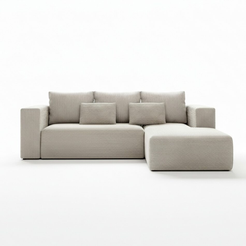 Jego nowoczesny design w kształcie litery L doskonale organizuje przestrzeń w salonie. Wyraźna faktura materiału Poso nadaje mu przytulnego charakteru. Kremowy odcień tapicerki subtelnie rozjaśnia wnętrze. Dlatego mebel staje się spokojną bazą dla wielu aranżacji, od skandynawskich po klasyczne. Wprowadza do domu atmosferę ciepła i wizualnej lekkości.