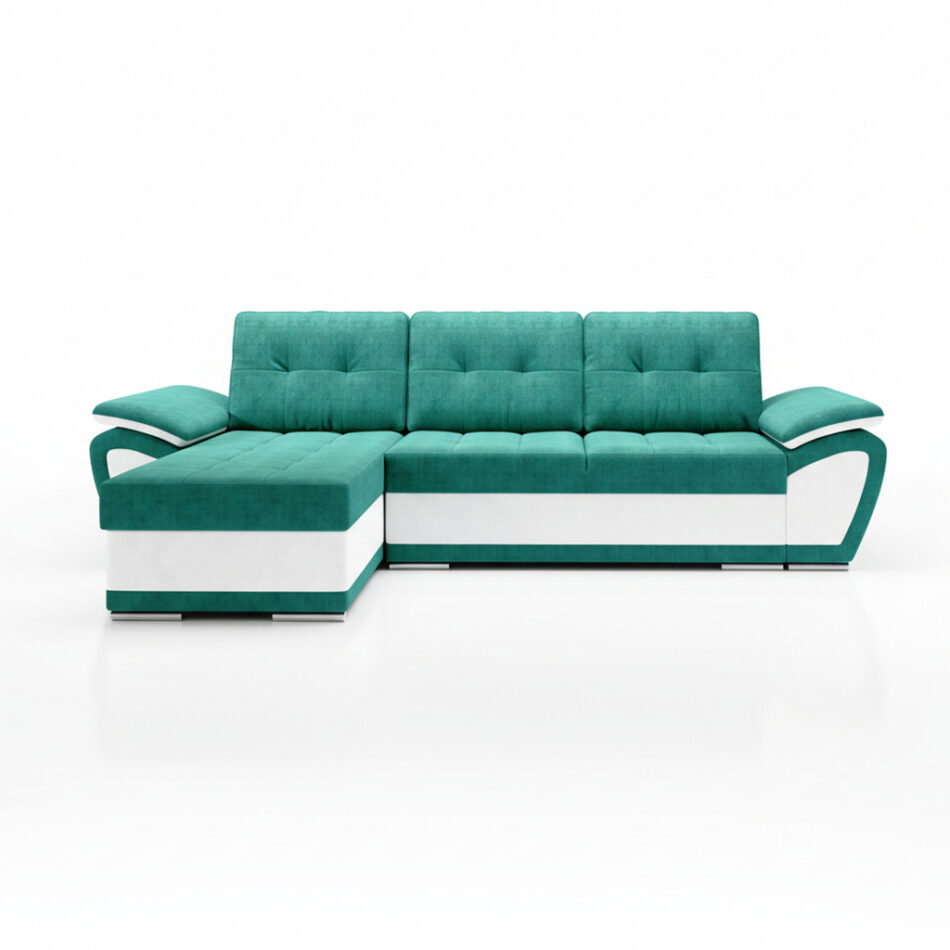 Jego nowoczesna bryła w kształcie litery L doskonale organizuje przestrzeń w salonie. Staje się jego centralnym punktem, zapraszając do wspólnego wypoczynku. Głęboki, turkusowy kolor tapicerki wnosi do wnętrza powiew świeżości i oryginalności. Dlatego świetnie dopełnia aranżacje w stylu nowoczesnym lub klasycznym z artystycznym akcentem, tworząc atmosferę pełną życia.