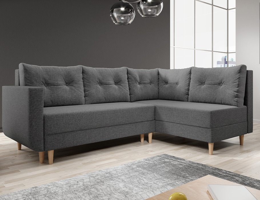 Narożnik wyposażono w intuicyjną funkcję spania typu DL. Wystarczy kilka prostych ruchów, aby przygotować wygodne miejsce do spania dla gości. Dodatkowym atutem jest ukryty w otomanie pojemnik. Umożliwia on przechowywanie pościeli, koców czy poduszek i pomaga zachować ład w salonie. Praktryczna tkanina Lux jest przyjazna zwierzętom oraz ułatwia czyszczenie. Dlatego rozlana kawa czy ślady łap pupila nie będą już problemem. Ciemnoszary odcień jest więc nie tylko stylowy, ale też bardzo praktyczny.