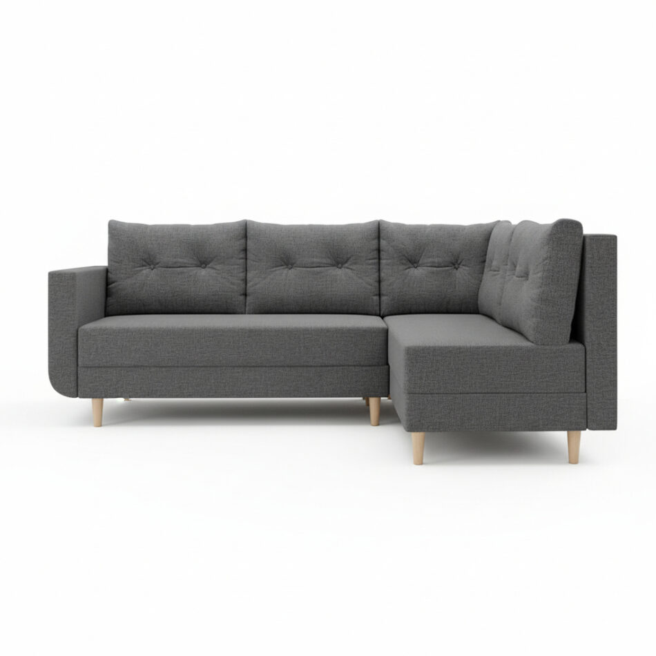Model ten zaprojektowano w kształcie litery L. Dzięki temu z łatwością dopasowuje się do przestrzeni w salonie, tworząc komfortową strefę wypoczynku. Głęboki, ciemnoszary kolor tapicerki stanowi doskonałą bazę dla różnych aranżacji, od nowoczesnych po klasyczne. Wprowadza do pomieszczenia atmosferę spokoju i harmonii, świetnie komponując się z drewnem lub metalowymi dodatkami. Co ważne, tapicerowany tył pozwala ustawić narożnik w dowolnym miejscu, nawet na środku pokoju.