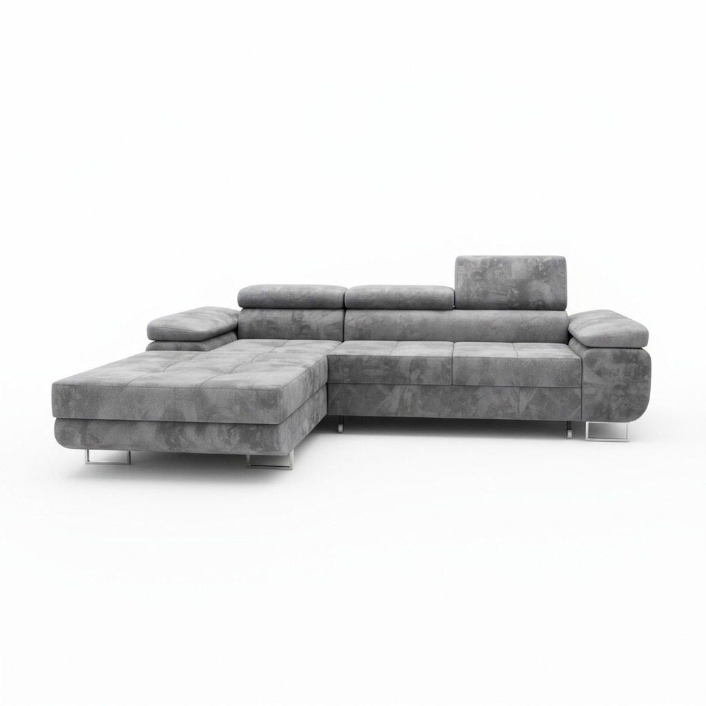Jego uniwersalna forma w kształcie litery L świetnie odnajdzie się w wielu aranżacjach. Dlatego mebel pasuje zarówno do wnętrz klasycznych, jak i tych o bardziej nowoczesnym charakterze. Szlachetny szary kolor tapicerki wprowadza do salonu atmosferę spokoju i elegancji. Stanowi subtelne tło dla wyrazistych dodatków lub współgra z neutralną paletą barw. Wysokie, chromowane nóżki dodają konstrukcji wizualnej lekkości. Co ważne, tapicerowany tył pozwala ustawić narożnik w dowolnym miejscu, nawet na środku pokoju.