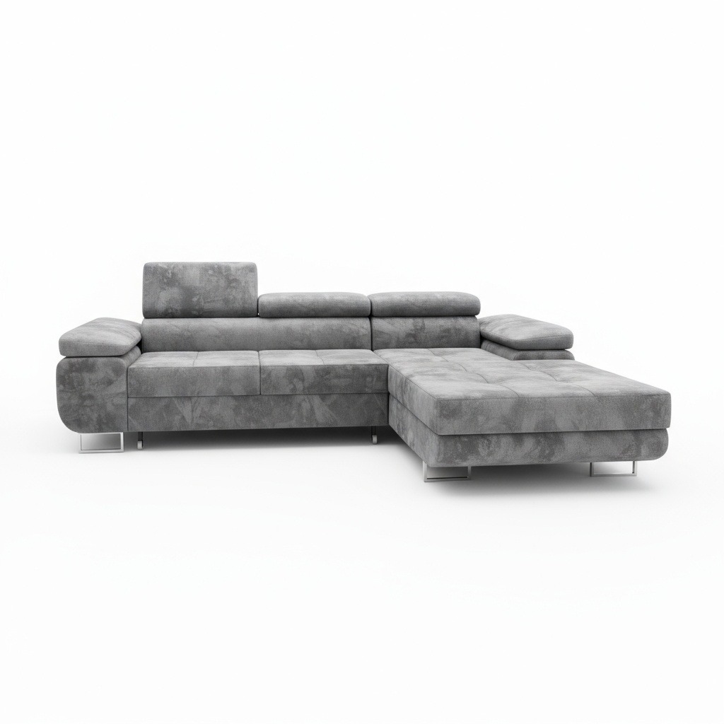 Jego praktyczny kształt w formie litery L doskonale odnajdzie się w przestrzeni salonu. Szlachetny, szary odcień tapicerki jest przy tym niezwykle uniwersalny. Dlatego z łatwością dopasuje się zarówno do wnętrz nowoczesnych, jak i tych o bardziej klasycznym charakterze. Co ważne, tapicerowany tył mebla pozwala na ustawienie go w dowolnym miejscu, nawet na środku pokoju. Całość osadzono na smukłych, chromowanych nóżkach. W ten sposób bryła zyskuje wizualną lekkość i elegancki wygląd.