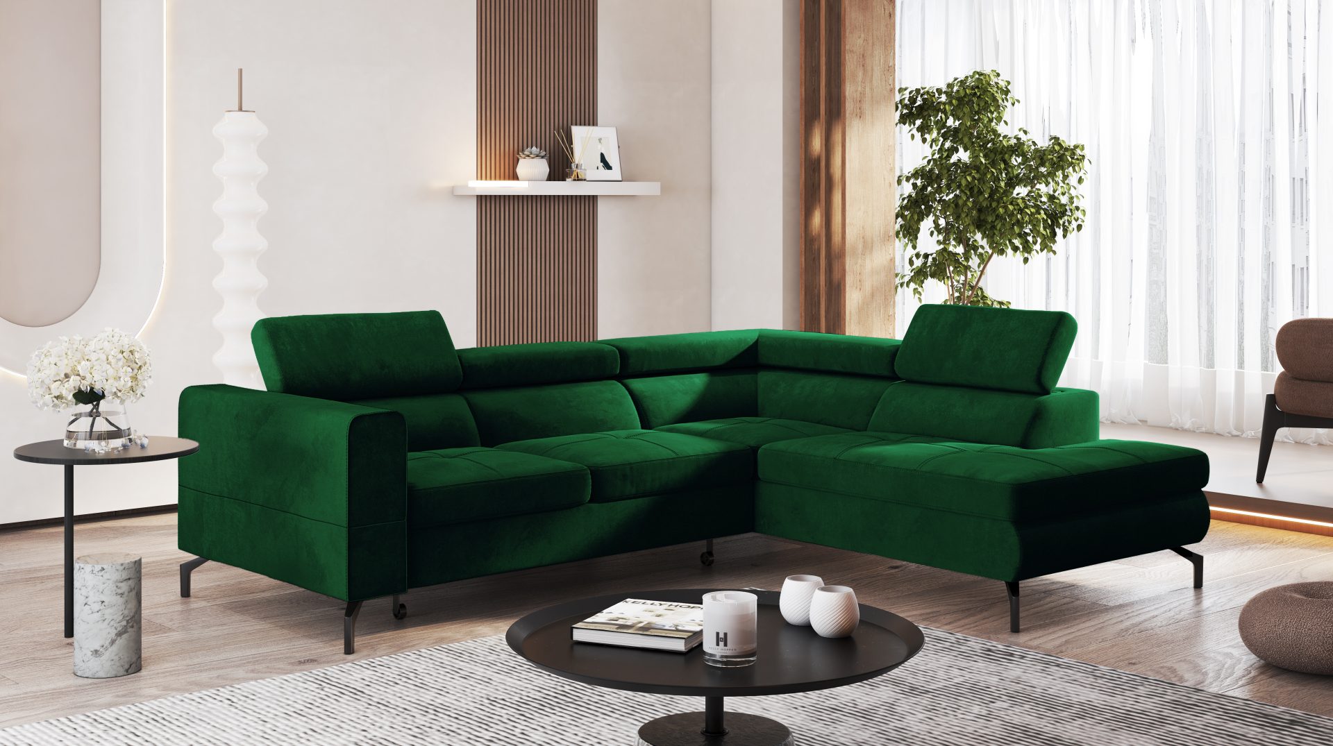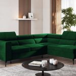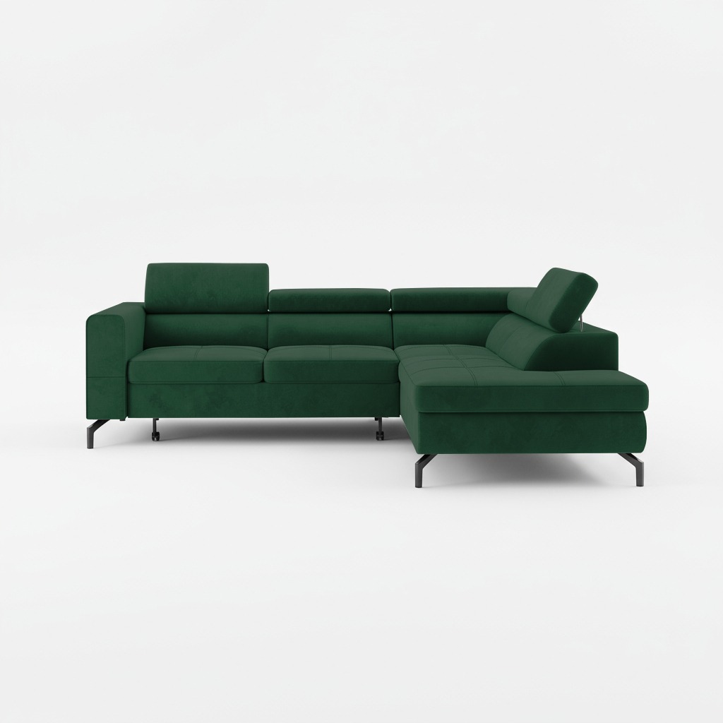 Jego forma w kształcie litery L doskonale wpisuje się w nowoczesne i klasyczne aranżacje. Głęboki odcień butelkowej zieleni wprowadza do wnętrza atmosferę spokoju oraz wyrafinowania. Kolor ten pięknie współgra z drewnianymi dodatkami. Równie dobrze komponuje się z metalicznymi akcentami. Całość osadzono na wysokich, czarnych nóżkach, które dodają konstrukcji wizualnej lekkości.